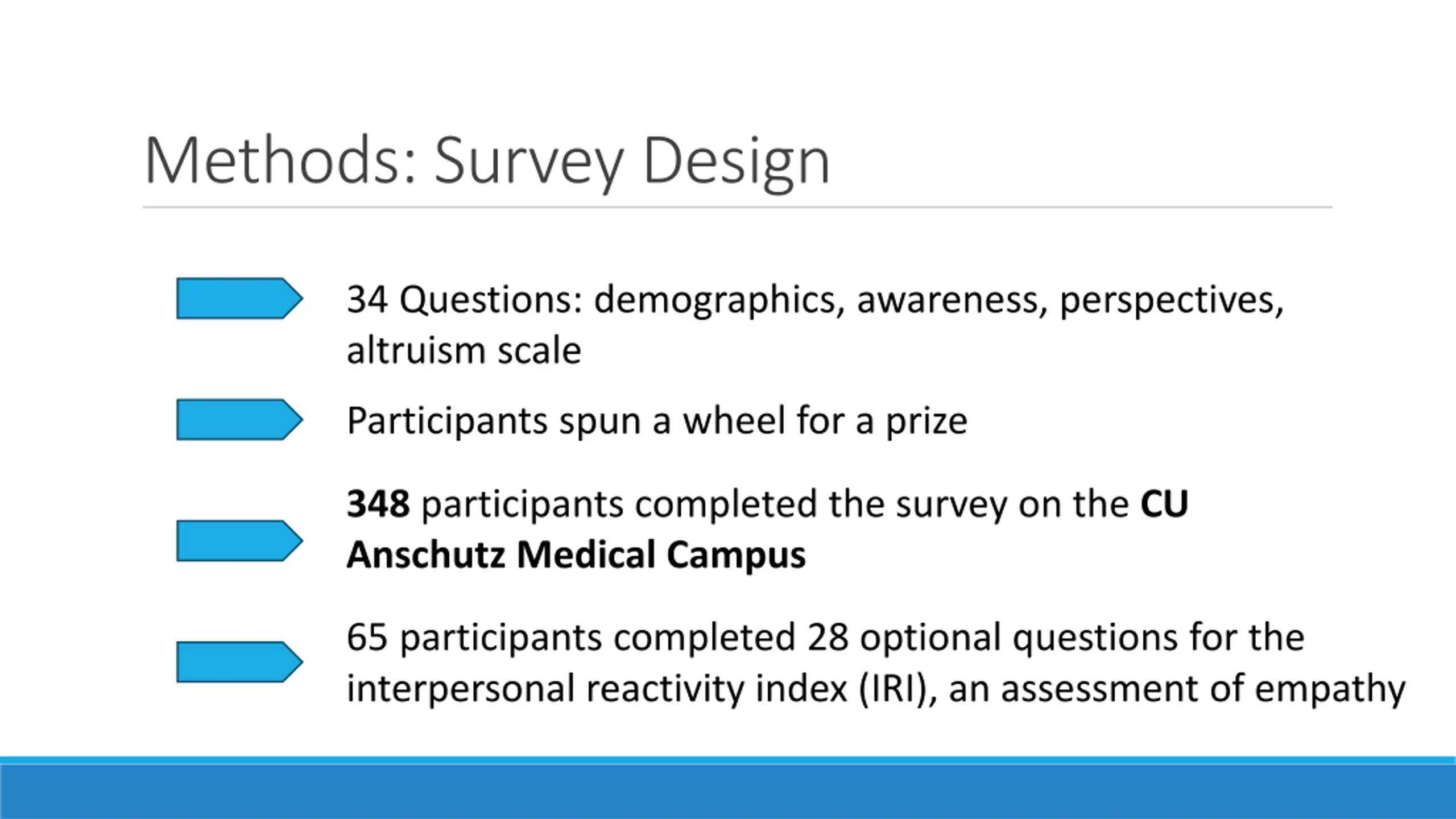 Methods: Survey Design 34 Questions: demographics, awareness, perspectives, altruism scale Participants spun a wheel for a prize 348 participants completed the survey on the CU Anschutz Medical Campus 65 participants completed 28 optional questions for the interpersonal reactivity index (IRI), an assessment of empathy