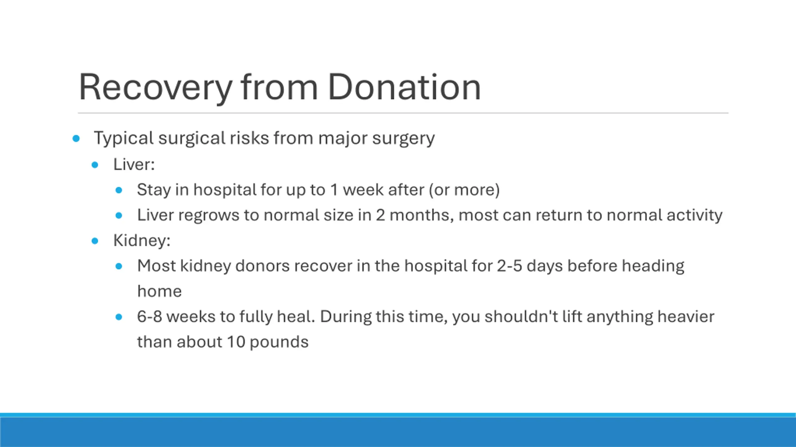 Recovery from Donation Typical surgical risks from major surgery Liver: Stay in hospital for up to 1 week after (or more) Liver regrows to normal size in 2 months, most can return to normal activity Kidney: Most kidney donors recover in the hospital for 2-5 days before heading home 6-8 weeks to fully heal. During this time, you shouldn't lift anything heavier than about 10 pounds