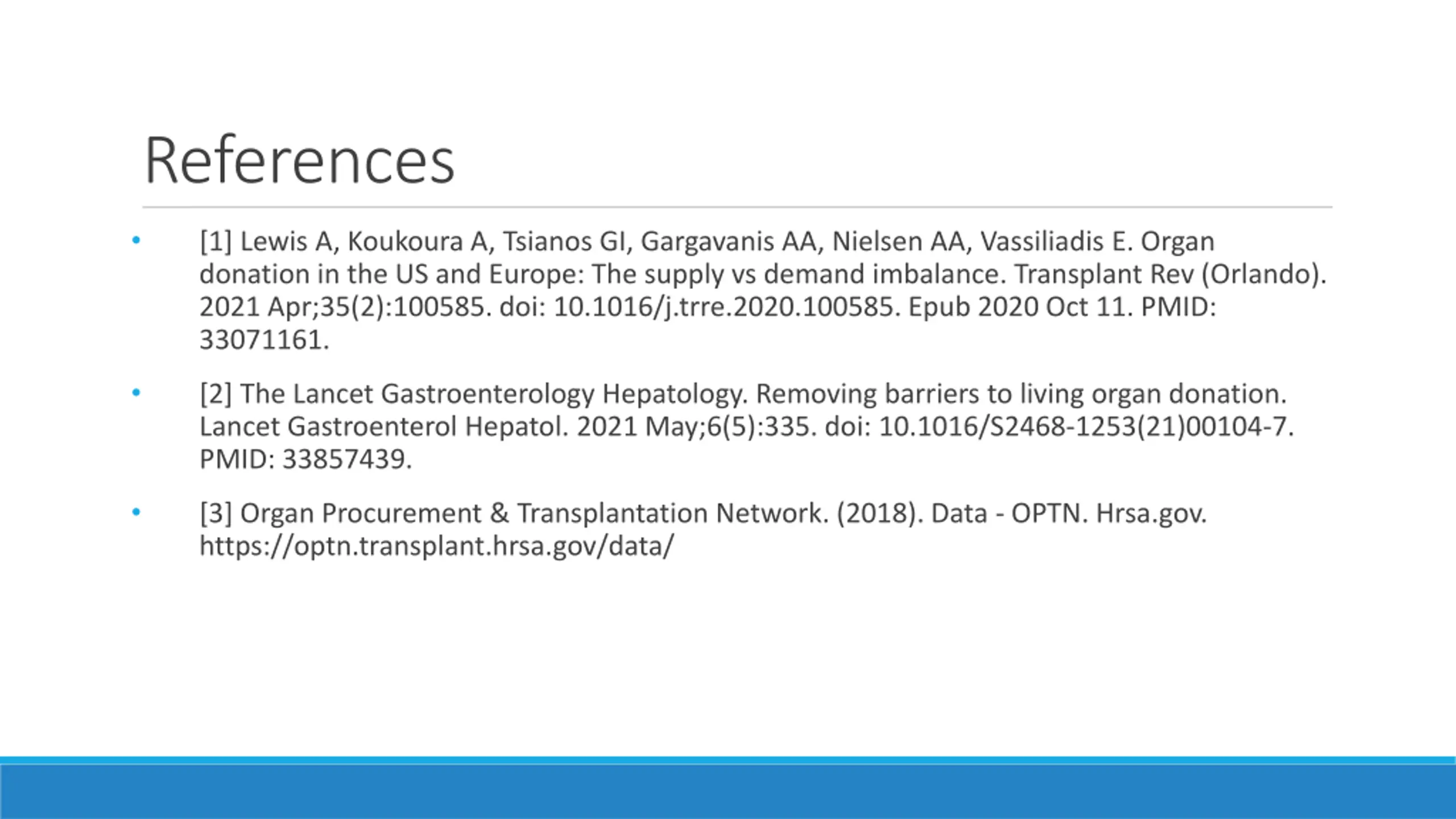 References [1] Lewis A, Koukoura A, Tsianos GI, Gargavanis AA, Nielsen AA, Vassiliadis E. Organ donation in the US and Europe: The supply vs demand imbalance. Transplant Rev (Orlando). 2021 Apr;35(2):100585. doi: 10.1016/j.trre.2020.100585. Epub 2020 Oct 11. PMID: 33071161. [2] The Lancet Gastroenterology Hepatology. Removing barriers to living organ donation. Lancet Gastroenterol Hepatol. 2021 May;6(5):335. doi: 10.1016/S2468-1253(21)00104-7. PMID: 33857439. [3] Organ Procurement & Transplantation Network. (2018). Data - OPTN. Hrsa.gov. https://optn.transplant.hrsa.gov/data/