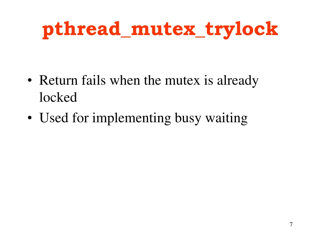 pthread_mutex_trylock Return fails when the mutex is already locked Used for implementing busy waiting 7