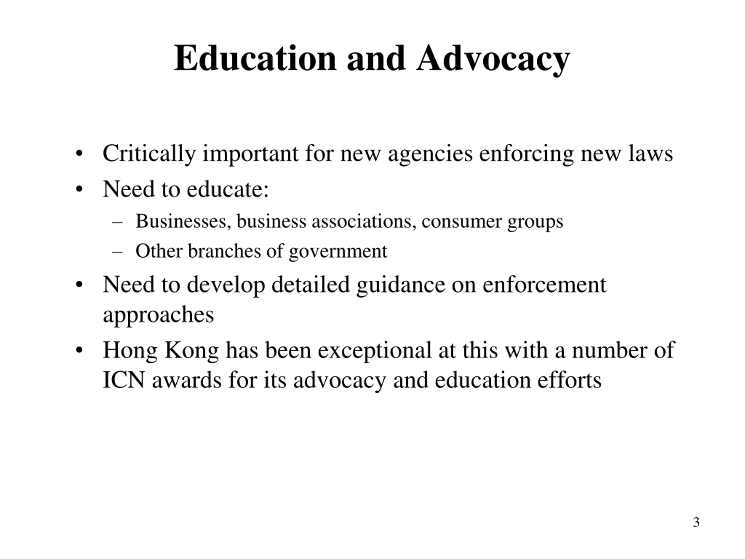 Education and Advocacy Critically important for new agencies enforcing new laws Need to educate: Businesses, business associations, consumer groups Other branches of government Need to develop detailed guidance on enforcement approaches Hong Kong has been exceptional at this with a number of ICN awards for its advocacy and education efforts 3