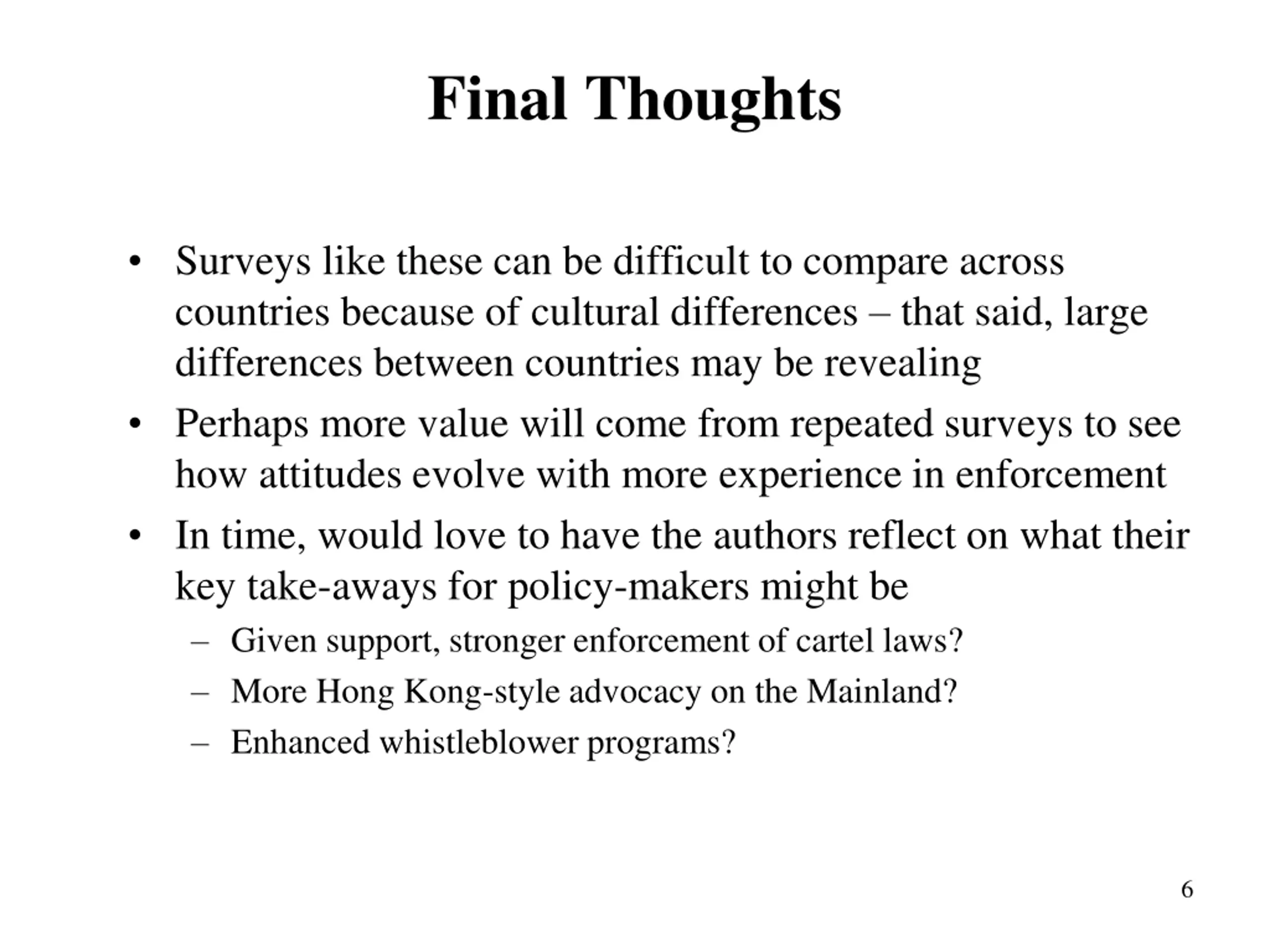 Selection of interesting results Mainland China: less likely to recognize a cartel and consider it bad (Hong Kong much more negative) Both (but especially HK): see price-fixing as dishonest but less blame-worthy than theft (more akin to fraud) Both: see punishment and compensation as important generally but Mainland China puts higher value on compensation, Hong Kong more on punishment Both: expect price-fixers will be caught Both like fines as punishment more than other countries less for naming and shaming Both approve of leniency policies 5