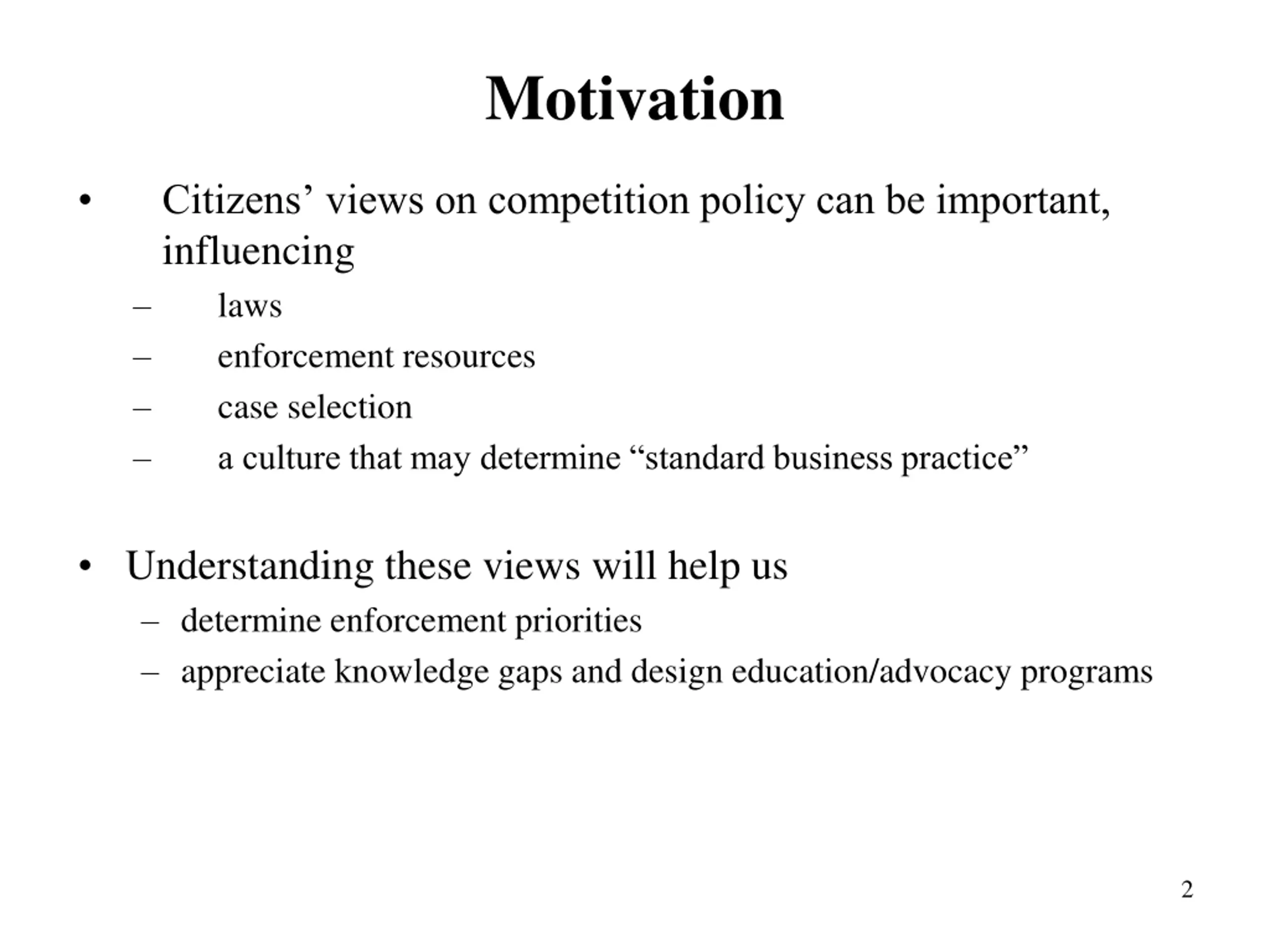 Motivation Citizens views on competition policy can be important, influencing laws enforcement resources case selection a culture that may determine standard business practice Understanding these views will help us determine enforcement priorities appreciate knowledge gaps and design education/advocacy programs 2