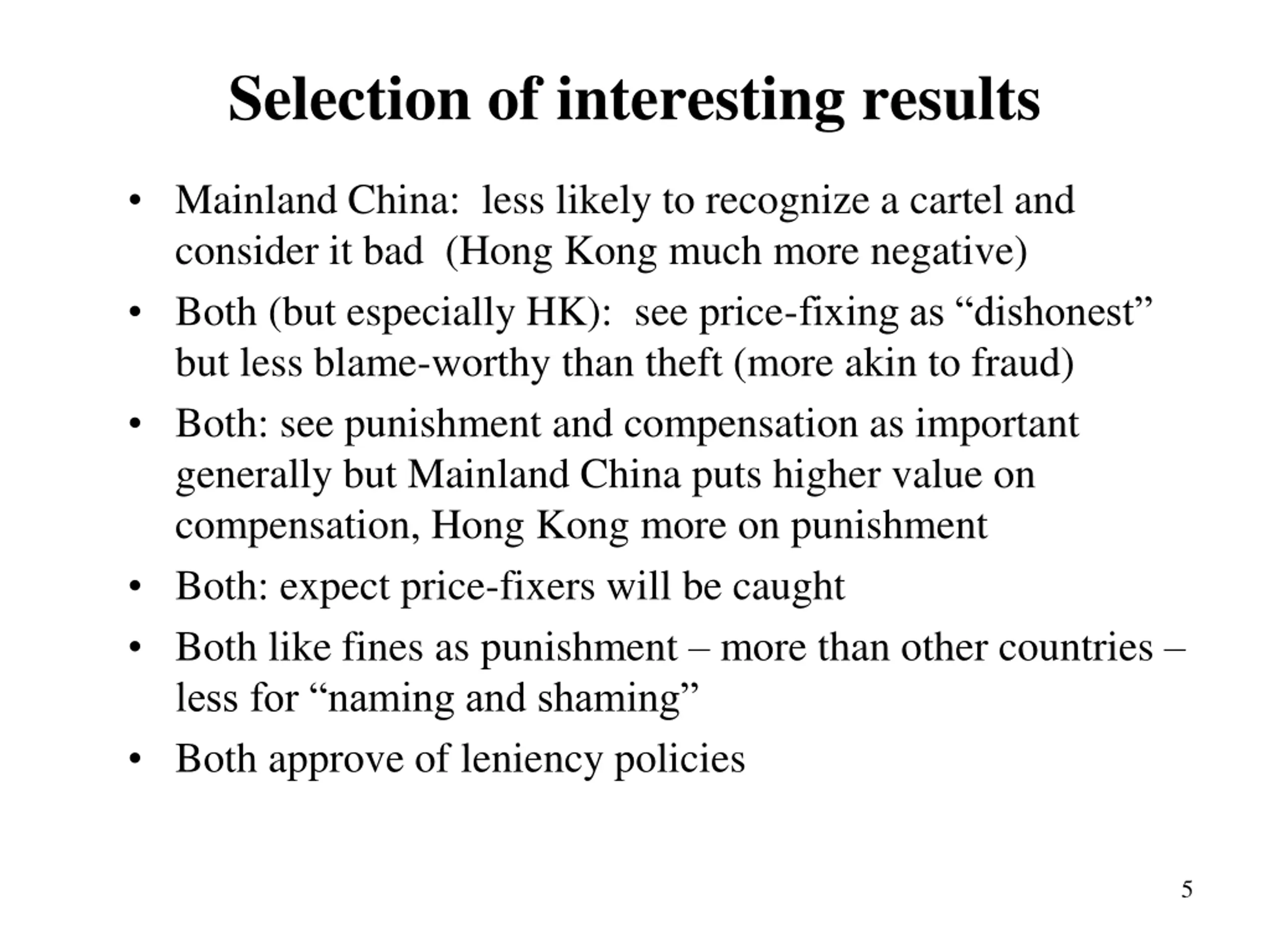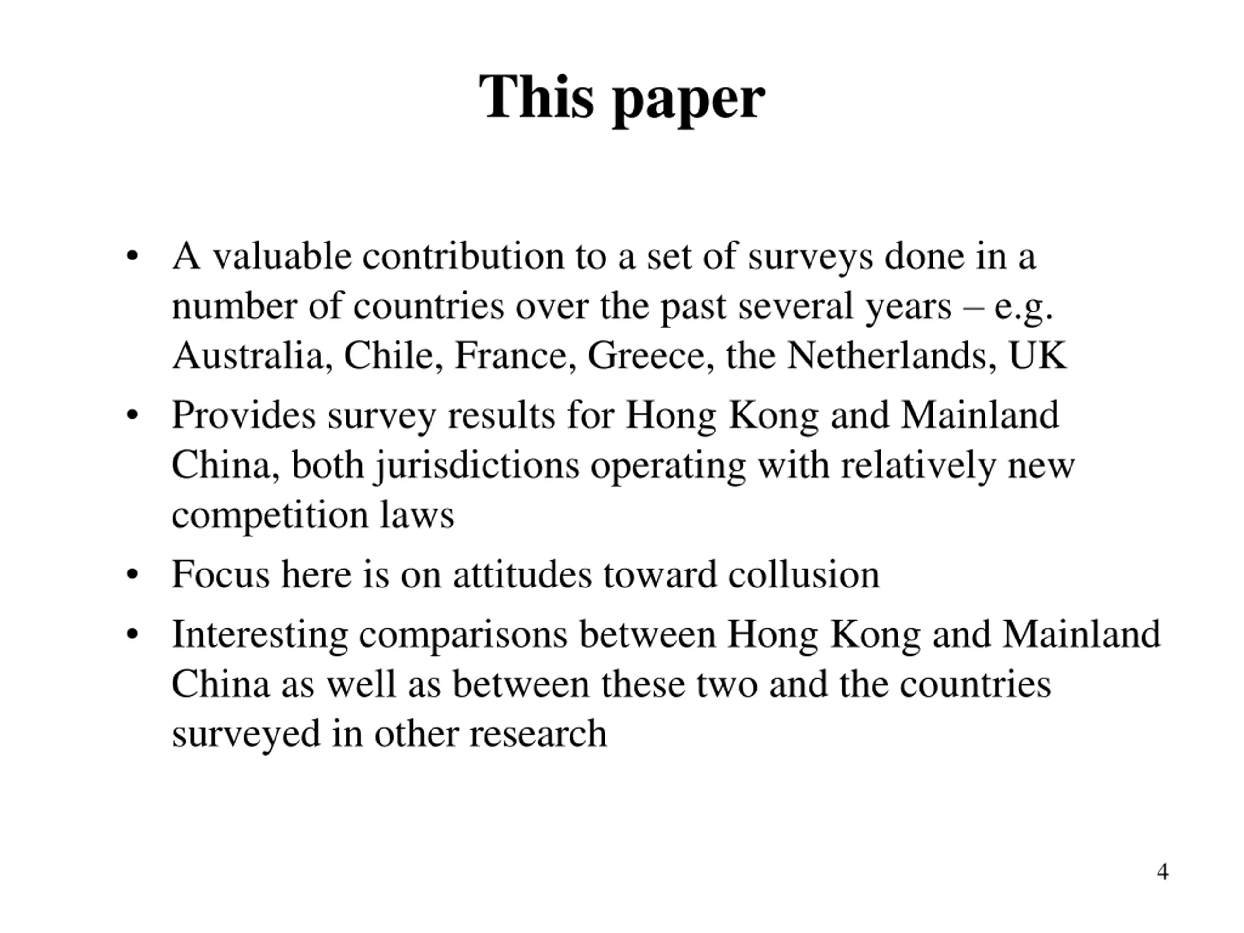 This paper A valuable contribution to a set of surveys done in a number of countries over the past several years e.g. Australia, Chile, France, Greece, the Netherlands, UK Provides survey results for Hong Kong and Mainland China, both jurisdictions operating with relatively new competition laws Focus here is on attitudes toward collusion Interesting comparisons between Hong Kong and Mainland China as well as between these two and the countries surveyed in other research 4