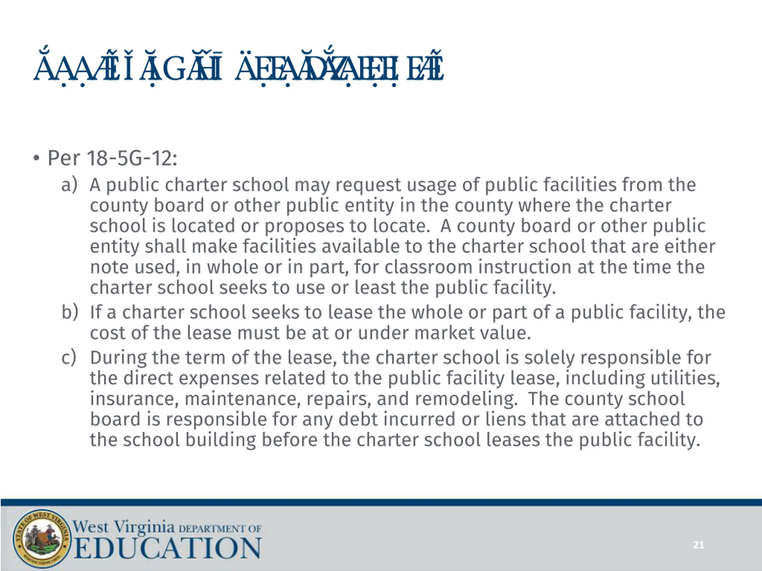 ACCE SS TO P U BLI C F ACI LI TI E S Per 18-5G-12: a) A public charter school may request usage of public facilities from the county board or other public entity in the county where the charter school is located or proposes to locate. A county board or other public entity shall make facilities available to the charter school that are either note used, in whole or in part, for classroom instruction at the time the charter school seeks to use or least the public facility. b) If a charter school seeks to lease the whole or part of a public facility, the cost of the lease must be at or under market value. c) During the term of the lease, the charter school is solely responsible for the direct expenses related to the public facility lease, including utilities, insurance, maintenance, repairs, and remodeling. The county school board is responsible for any debt incurred or liens that are attached to the school building before the charter school leases the public facility. 21