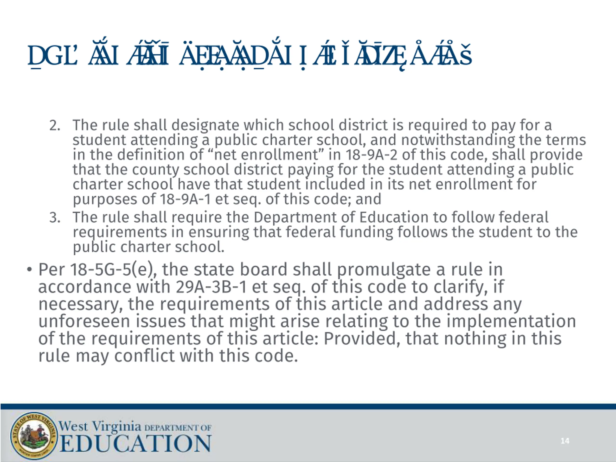 HOW ARE P U BLI C CHARTE RS F U NDE D? 2. The rule shall designate which school district is required to pay for a student attending a public charter school, and notwithstanding the terms in the definition of net enrollment in 18-9A-2 of this code, shall provide that the county school district paying for the student attending a public charter school have that student included in its net enrollment for purposes of 18-9A-1 et seq. of this code; and 3. The rule shall require the Department of Education to follow federal requirements in ensuring that federal funding follows the student to the public charter school. Per 18-5G-5(e), the state board shall promulgate a rule in accordance with 29A-3B-1 et seq. of this code to clarify, if necessary, the requirements of this article and address any unforeseen issues that might arise relating to the implementation of the requirements of this article: Provided, that nothing in this rule may conflict with this code. 14