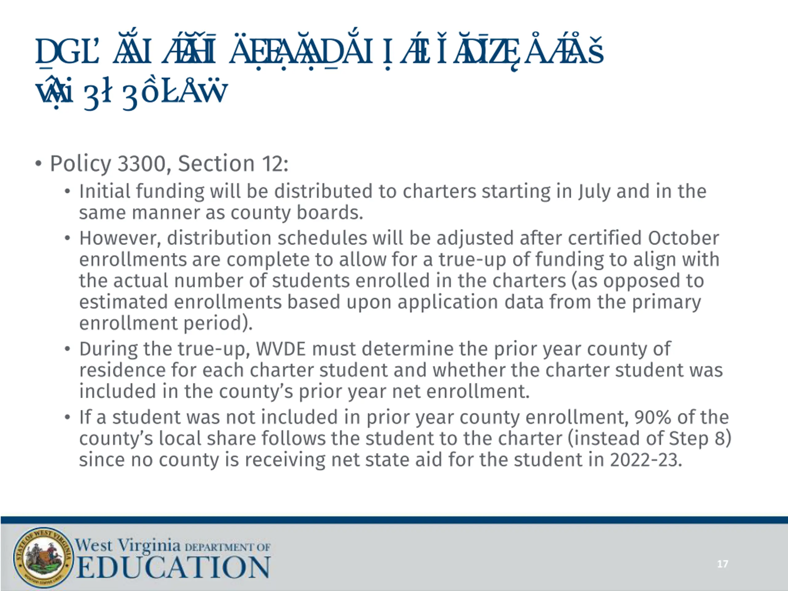 HOW ARE P U BLI C CHARTE RS F U NDE D? ( Co nti nued) Policy 3300, Section 12: Initial funding will be distributed to charters starting in July and in the same manner as county boards. However, distribution schedules will be adjusted after certified October enrollments are complete to allow for a true-up of funding to align with the actual number of students enrolled in the charters (as opposed to estimated enrollments based upon application data from the primary enrollment period). During the true-up, WVDE must determine the prior year county of residence for each charter student and whether the charter student was included in the county s prior year net enrollment. If a student was not included in prior year county enrollment, 90% of the county s local share follows the student to the charter (instead of Step 8) since no county is receiving net state aid for the student in 2022-23. 17