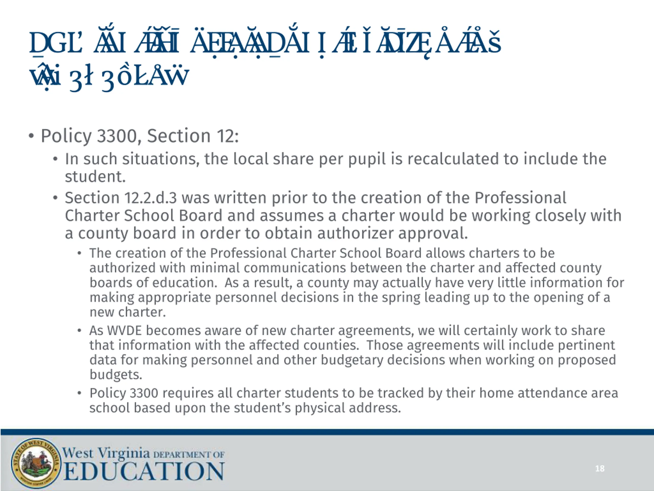 HOW ARE P U BLI C CHARTE RS F U NDE D? ( Co nti nued) Policy 3300, Section 12: In such situations, the local share per pupil is recalculated to include the student. Section 12.2.d.3 was written prior to the creation of the Professional Charter School Board and assumes a charter would be working closely with a county board in order to obtain authorizer approval. The creation of the Professional Charter School Board allows charters to be authorized with minimal communications between the charter and affected county boards of education. As a result, a county may actually have very little information for making appropriate personnel decisions in the spring leading up to the opening of a new charter. As WVDE becomes aware of new charter agreements, we will certainly work to share that information with the affected counties. Those agreements will include pertinent data for making personnel and other budgetary decisions when working on proposed budgets. Policy 3300 requires all charter students to be tracked by their home attendance area school based upon the student s physical address. 18