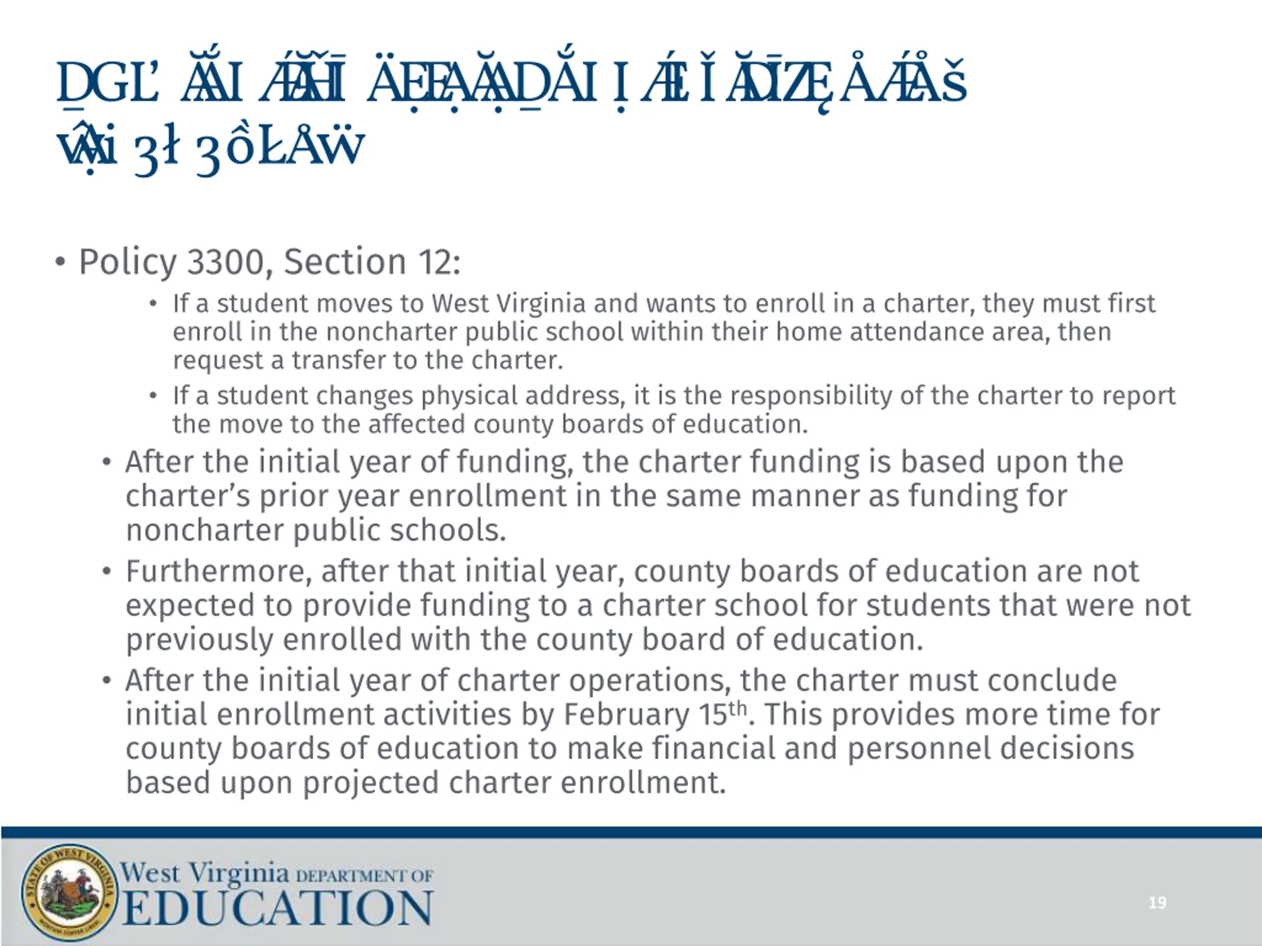 HOW ARE P U BLI C CHARTE RS F U NDE D? ( Co nti nued) Policy 3300, Section 12: If a student moves to West Virginia and wants to enroll in a charter, they must first enroll in the noncharter public school within their home attendance area, then request a transfer to the charter. If a student changes physical address, it is the responsibility of the charter to report the move to the affected county boards of education. After the initial year of funding, the charter funding is based upon the charter s prior year enrollment in the same manner as funding for noncharter public schools. Furthermore, after that initial year, county boards of education are not expected to provide funding to a charter school for students that were not previously enrolled with the county board of education. After the initial year of charter operations, the charter must conclude initial enrollment activities by February 15th. This provides more time for county boards of education to make financial and personnel decisions based upon projected charter enrollment. 19