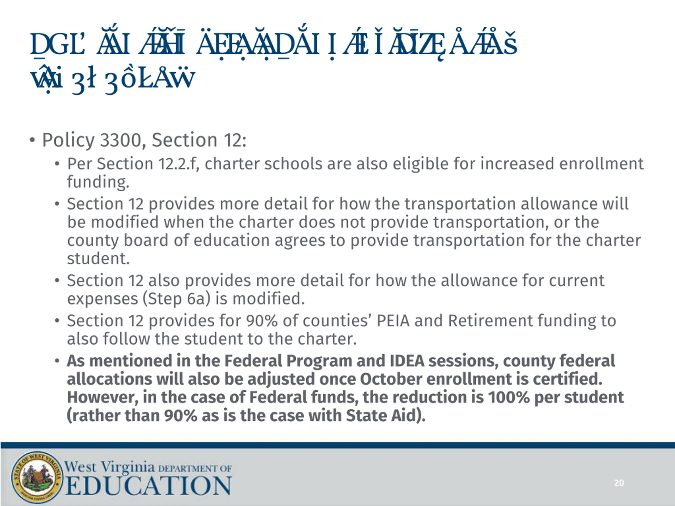 HOW ARE P U BLI C CHARTE RS F U NDE D? ( Co nti nued) Policy 3300, Section 12: Per Section 12.2.f, charter schools are also eligible for increased enrollment funding. Section 12 provides more detail for how the transportation allowance will be modified when the charter does not provide transportation, or the county board of education agrees to provide transportation for the charter student. Section 12 also provides more detail for how the allowance for current expenses (Step 6a) is modified. Section 12 provides for 90% of counties PEIA and Retirement funding to also follow the student to the charter. As mentioned in the Federal Program and IDEA sessions, county federal allocations will also be adjusted once October enrollment is certified. However, in the case of Federal funds, the reduction is 100% per student (rather than 90% as is the case with State Aid). 20