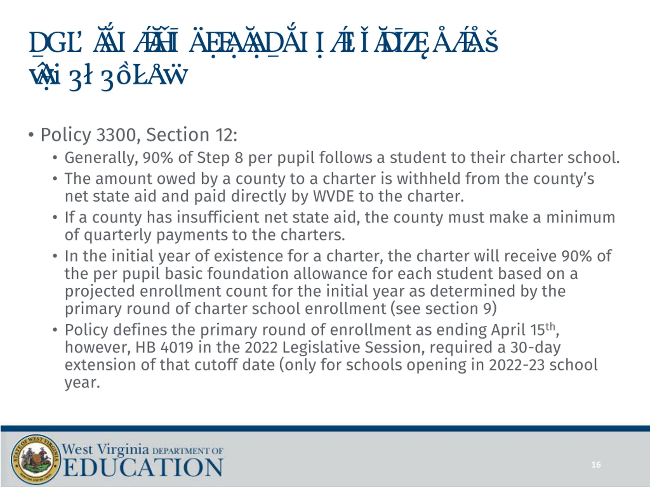 HOW ARE P U BLI C CHARTE RS F U NDE D? ( Co nti nued) Policy 3300, Section 12: Generally, 90% of Step 8 per pupil follows a student to their charter school. The amount owed by a county to a charter is withheld from the county s net state aid and paid directly by WVDE to the charter. If a county has insufficient net state aid, the county must make a minimum of quarterly payments to the charters. In the initial year of existence for a charter, the charter will receive 90% of the per pupil basic foundation allowance for each student based on a projected enrollment count for the initial year as determined by the primary round of charter school enrollment (see section 9) Policy defines the primary round of enrollment as ending April 15th, however, HB 4019 in the 2022 Legislative Session, required a 30-day extension of that cutoff date (only for schools opening in 2022-23 school year. 16
