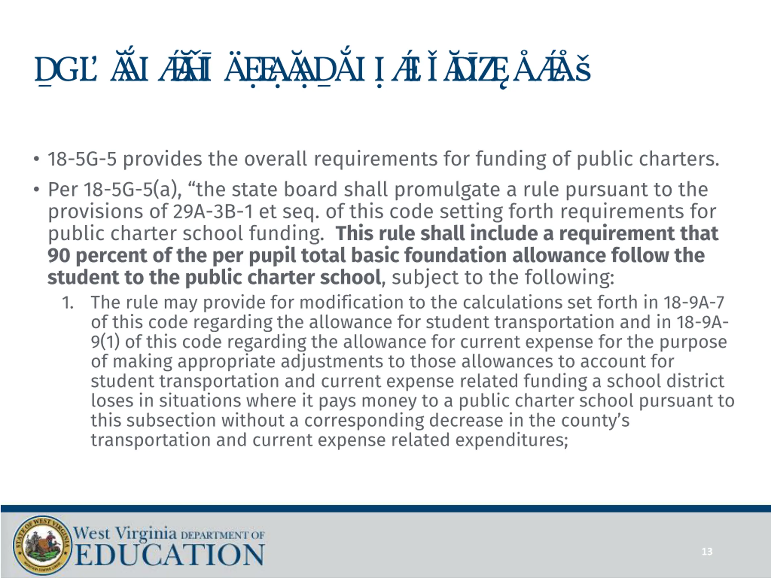 HOW ARE P U BLI C CHARTE RS F U NDE D? 18-5G-5 provides the overall requirements for funding of public charters. Per 18-5G-5(a), the state board shall promulgate a rule pursuant to the provisions of 29A-3B-1 et seq. of this code setting forth requirements for public charter school funding. This rule shall include a requirement that 90 percent of the per pupil total basic foundation allowance follow the student to the public charter school, subject to the following: 1. The rule may provide for modification to the calculations set forth in 18-9A-7 of this code regarding the allowance for student transportation and in 18-9A- 9(1) of this code regarding the allowance for current expense for the purpose of making appropriate adjustments to those allowances to account for student transportation and current expense related funding a school district loses in situations where it pays money to a public charter school pursuant to this subsection without a corresponding decrease in the county s transportation and current expense related expenditures; 13