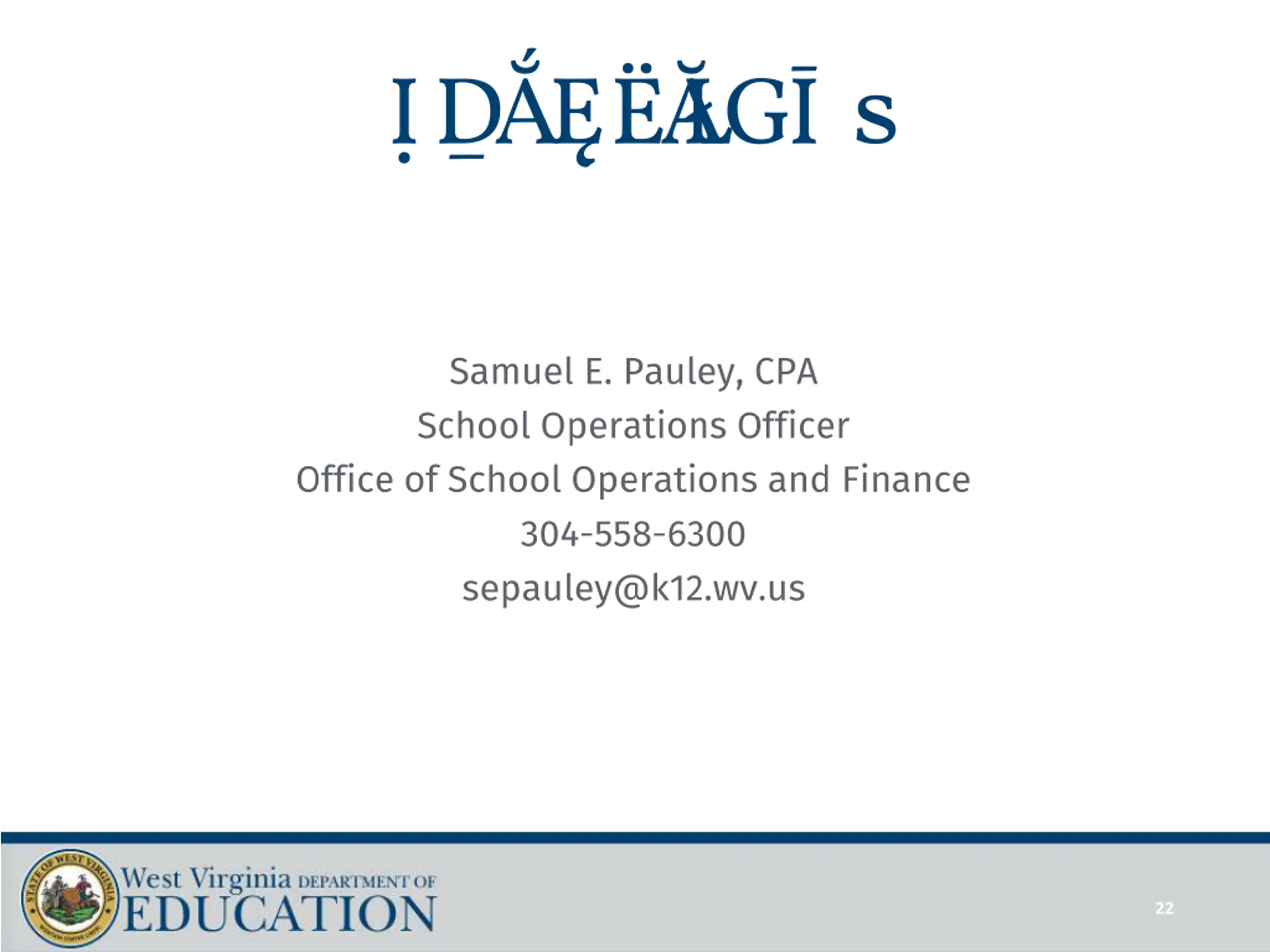 THANK YOU ! Samuel E. Pauley, CPA School Operations Officer Office of School Operations and Finance 304-558-6300 sepauley@k12.wv.us 22