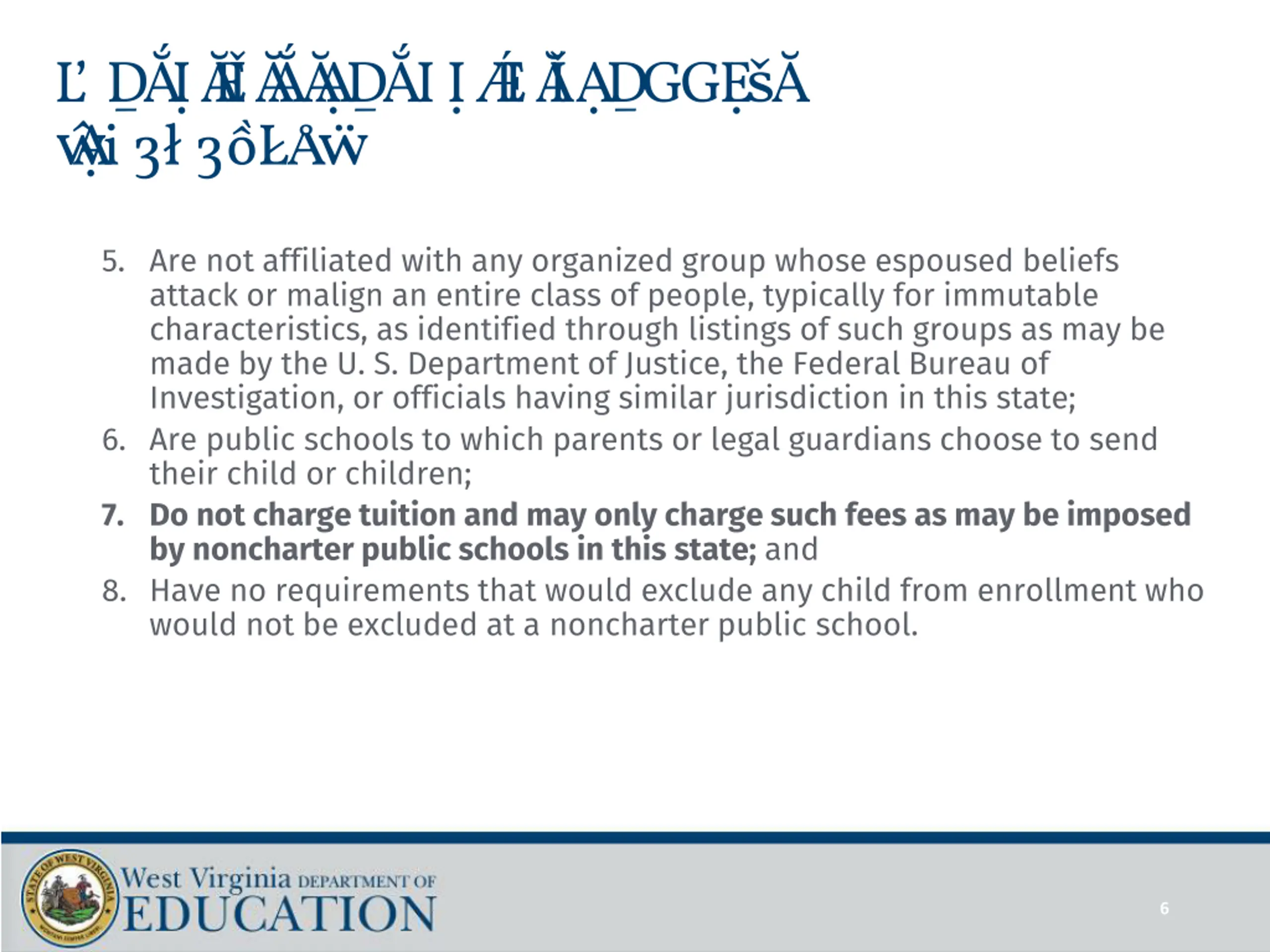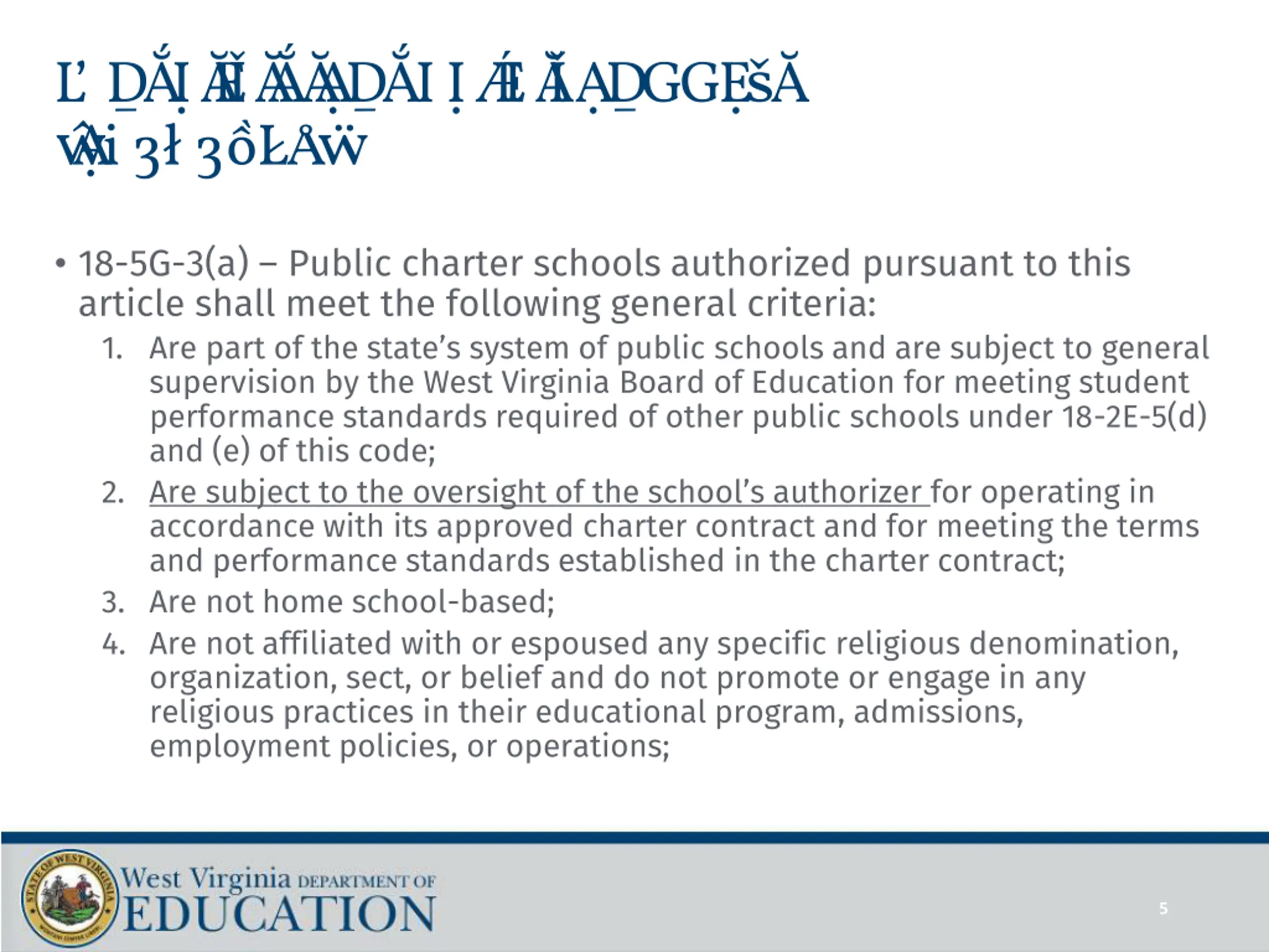 W HA T I S A CHARTE R SCHOOL? ( Co nti nued) 18-5G-3(a) Public charter schools authorized pursuant to this article shall meet the following general criteria: 1. Are part of the state s system of public schools and are subject to general supervision by the West Virginia Board of Education for meeting student performance standards required of other public schools under 18-2E-5(d) and (e) of this code; 2. Are subject to the oversight of the school s authorizer for operating in accordance with its approved charter contract and for meeting the terms and performance standards established in the charter contract; 3. Are not home school-based; 4. Are not affiliated with or espoused any specific religious denomination, organization, sect, or belief and do not promote or engage in any religious practices in their educational program, admissions, employment policies, or operations; 5