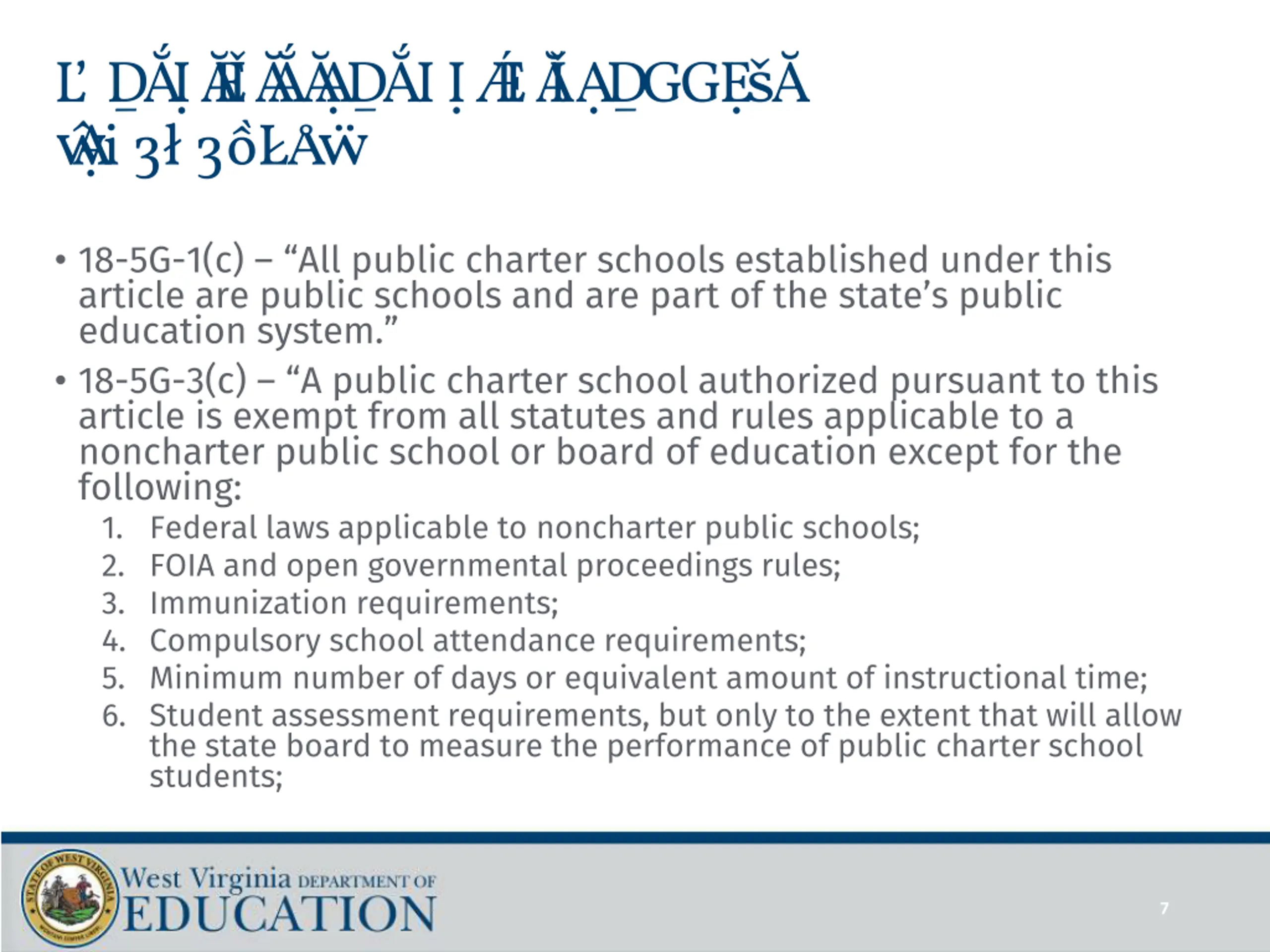 W HA T I S A CHARTE R SCHOOL? ( Co nti nued) 18-5G-1(c) All public charter schools established under this article are public schools and are part of the state s public education system. 18-5G-3(c) A public charter school authorized pursuant to this article is exempt from all statutes and rules applicable to a noncharter public school or board of education except for the following: 1. Federal laws applicable to noncharter public schools; 2. FOIA and open governmental proceedings rules; 3. Immunization requirements; 4. Compulsory school attendance requirements; 5. Minimum number of days or equivalent amount of instructional time; 6. Student assessment requirements, but only to the extent that will allow the state board to measure the performance of public charter school students; 7