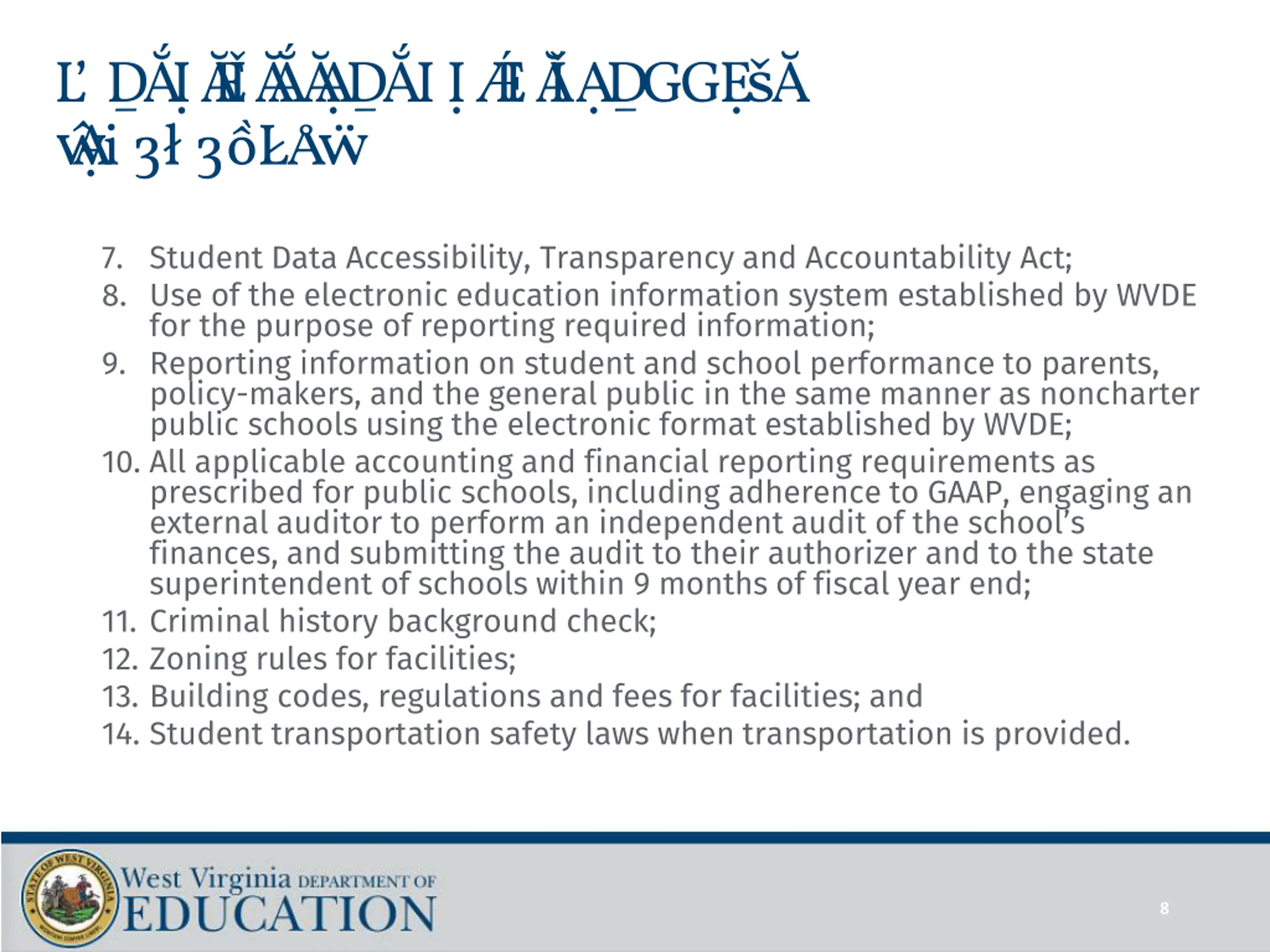 W HA T I S A CHARTE R SCHOOL? ( Co nti nued) 7. Student Data Accessibility, Transparency and Accountability Act; 8. Use of the electronic education information system established by WVDE for the purpose of reporting required information; 9. Reporting information on student and school performance to parents, policy-makers, and the general public in the same manner as noncharter public schools using the electronic format established by WVDE; 10. All applicable accounting and financial reporting requirements as prescribed for public schools, including adherence to GAAP, engaging an external auditor to perform an independent audit of the school s finances, and submitting the audit to their authorizer and to the state superintendent of schools within 9 months of fiscal year end; 11. Criminal history background check; 12. Zoning rules for facilities; 13. Building codes, regulations and fees for facilities; and 14. Student transportation safety laws when transportation is provided. 8