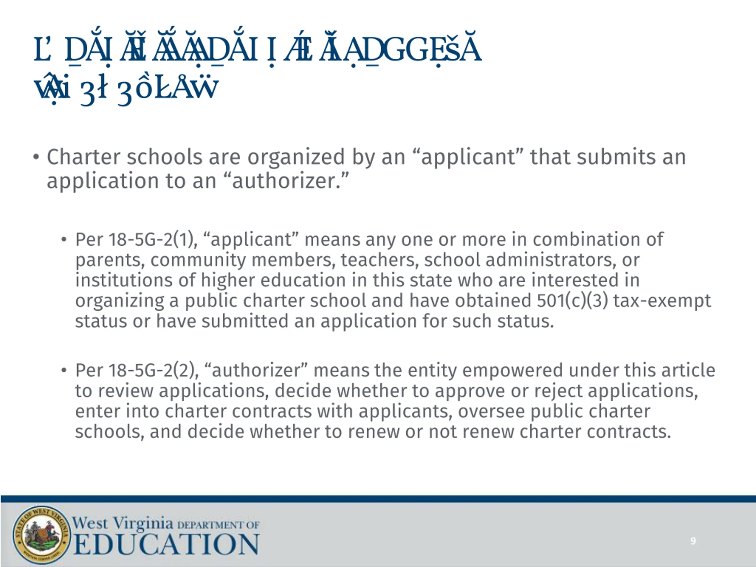W HA T I S A CHARTE R SCHOOL? ( Co nti nued) Charter schools are organized by an applicant that submits an application to an authorizer. Per 18-5G-2(1), applicant means any one or more in combination of parents, community members, teachers, school administrators, or institutions of higher education in this state who are interested in organizing a public charter school and have obtained 501(c)(3) tax-exempt status or have submitted an application for such status. Per 18-5G-2(2), authorizer means the entity empowered under this article to review applications, decide whether to approve or reject applications, enter into charter contracts with applicants, oversee public charter schools, and decide whether to renew or not renew charter contracts. 9
