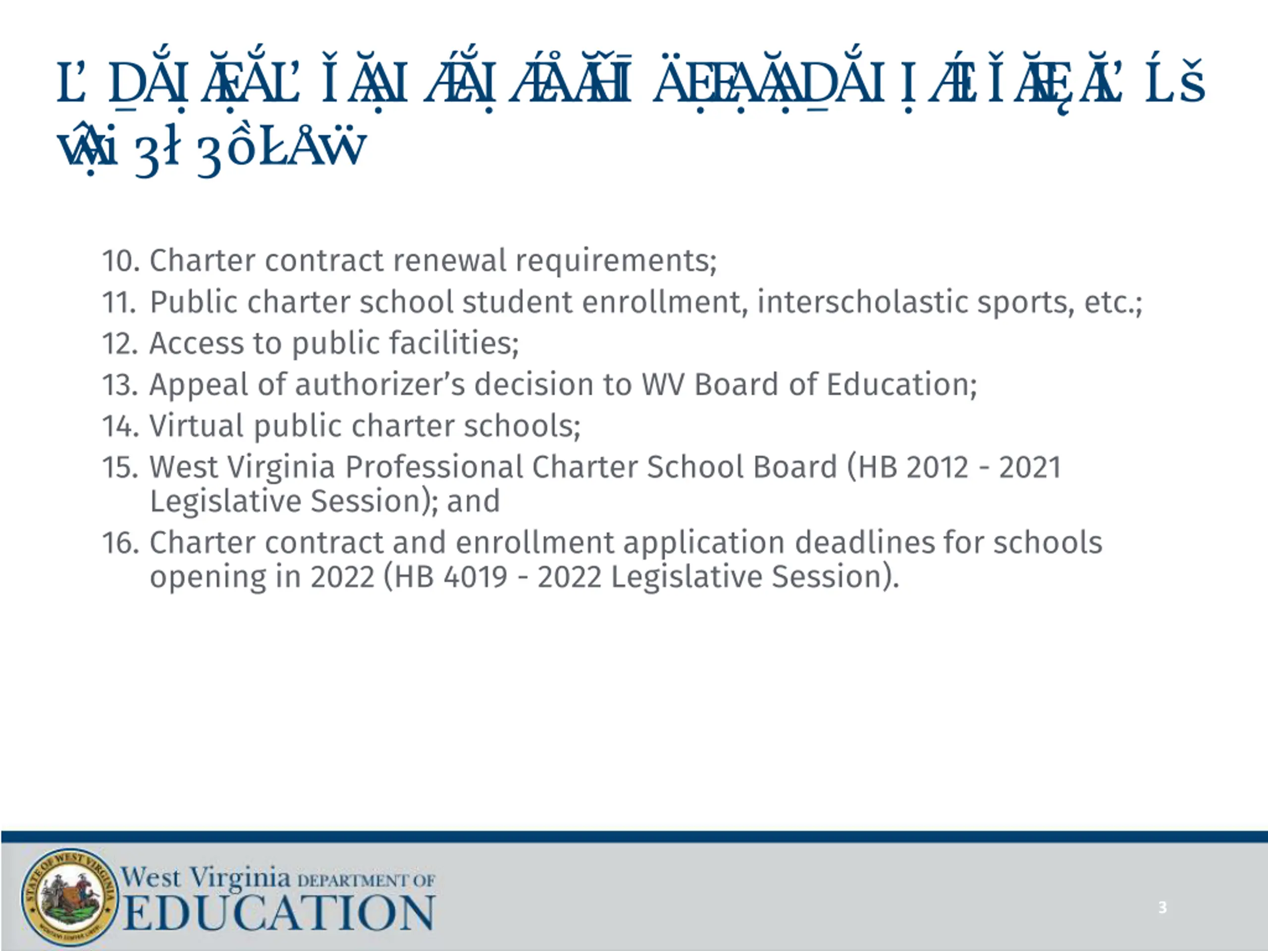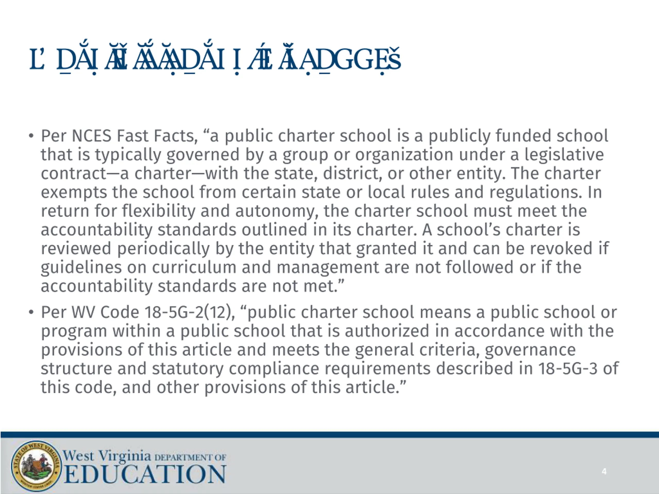 W HA T LAW S CRE A TE D P U BLI C CHARTE RS I N W V? ( Co nti nued) 10. Charter contract renewal requirements; 11. Public charter school student enrollment, interscholastic sports, etc.; 12. Access to public facilities; 13. Appeal of authorizer s decision to WV Board of Education; 14. Virtual public charter schools; 15. West Virginia Professional Charter School Board (HB 2012 - 2021 Legislative Session); and 16. Charter contract and enrollment application deadlines for schools opening in 2022 (HB 4019 - 2022 Legislative Session). 3
