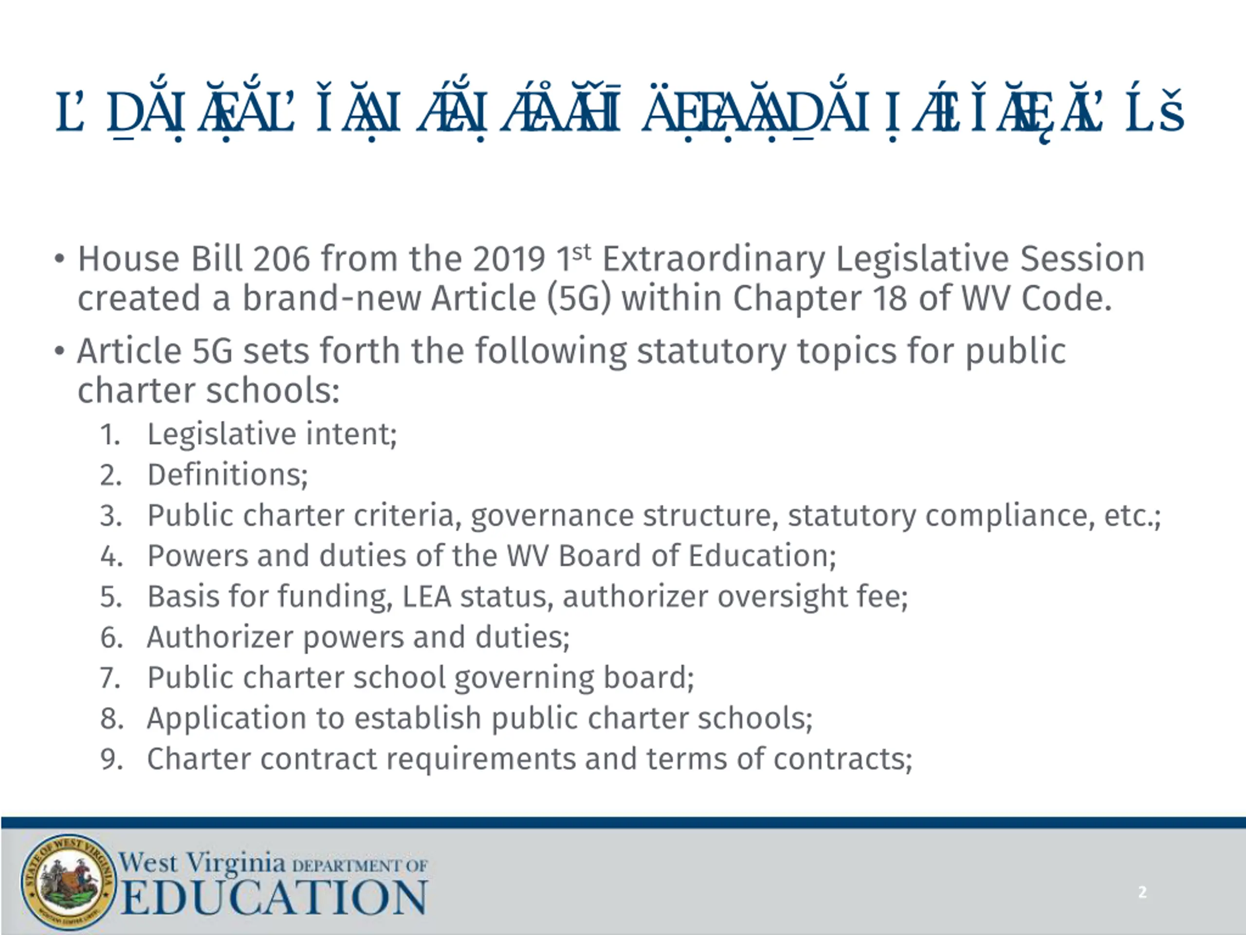 W HA T LAW S CRE A TE D P U BLI C CHARTE RS I N W V? House Bill 206 from the 2019 1stExtraordinary Legislative Session created a brand-new Article (5G) within Chapter 18 of WV Code. Article 5G sets forth the following statutory topics for public charter schools: 1. Legislative intent; 2. Definitions; 3. Public charter criteria, governance structure, statutory compliance, etc.; 4. Powers and duties of the WV Board of Education; 5. Basis for funding, LEA status, authorizer oversight fee; 6. Authorizer powers and duties; 7. Public charter school governing board; 8. Application to establish public charter schools; 9. Charter contract requirements and terms of contracts; 2