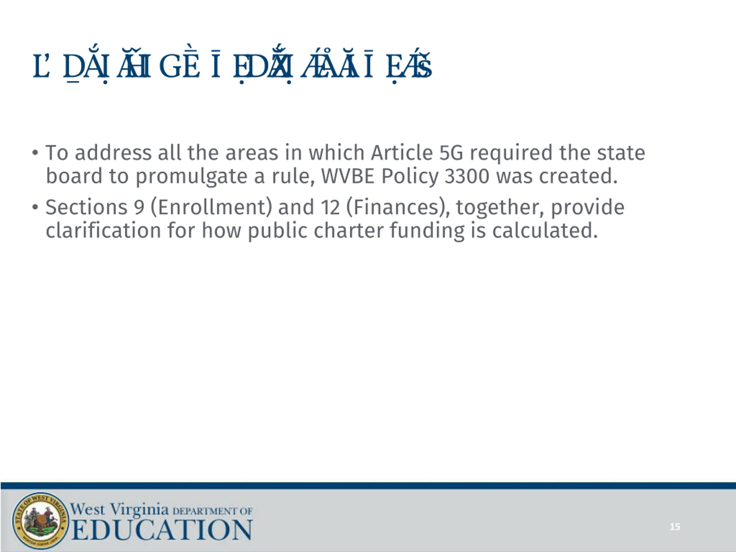 W HA T P ROM U L G A TE D RU LE ? To address all the areas in which Article 5G required the state board to promulgate a rule, WVBE Policy 3300 was created. Sections 9 (Enrollment) and 12 (Finances), together, provide clarification for how public charter funding is calculated. 15