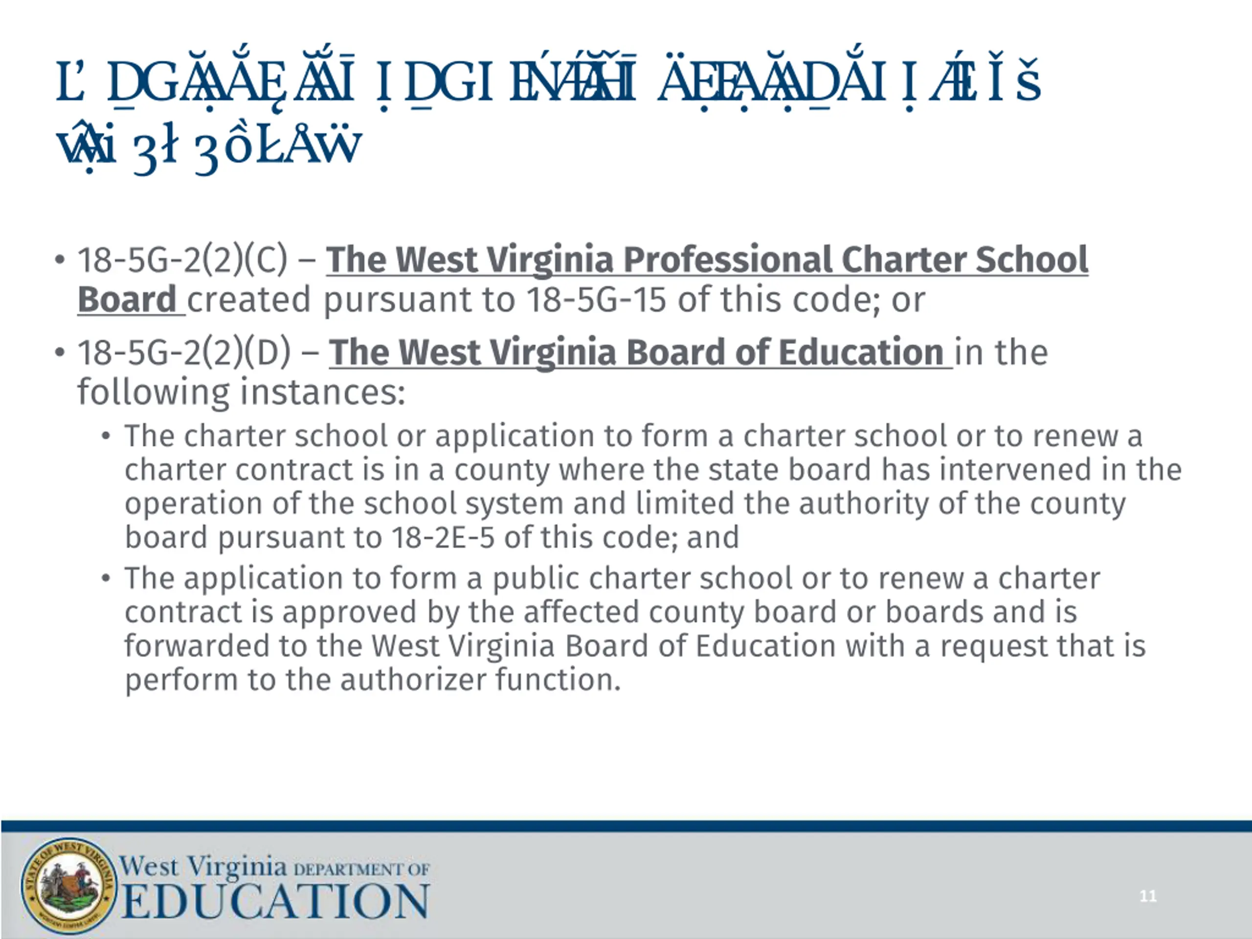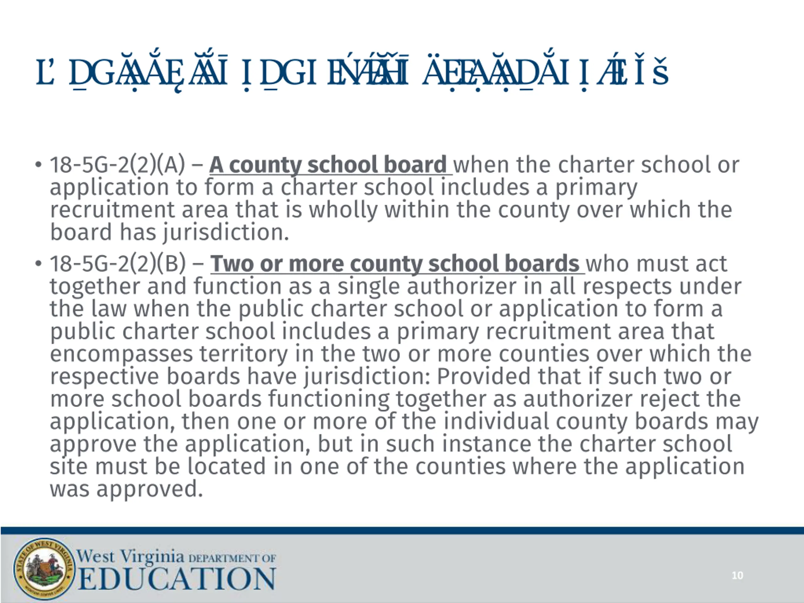 W HO CAN AU THORI Z E P U BLI C CHARTE RS? 18-5G-2(2)(A) A county school board when the charter school or application to form a charter school includes a primary recruitment area that is wholly within the county over which the board has jurisdiction. 18-5G-2(2)(B) Two or more county school boards who must act together and function as a single authorizer in all respects under the law when the public charter school or application to form a public charter school includes a primary recruitment area that encompasses territory in the two or more counties over which the respective boards have jurisdiction: Provided that if such two or more school boards functioning together as authorizer reject the application, then one or more of the individual county boards may approve the application, but in such instance the charter school site must be located in one of the counties where the application was approved. 10