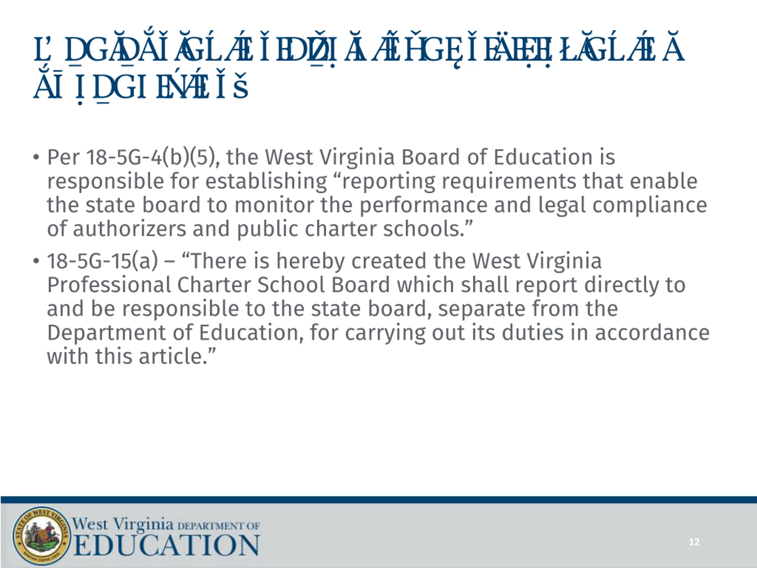 W HO HAS OVE RSI G HT RE SP ONSI BI LI TY OVE R AU THORI Z E RS? Per 18-5G-4(b)(5), the West Virginia Board of Education is responsible for establishing reporting requirements that enable the state board to monitor the performance and legal compliance of authorizers and public charter schools. 18-5G-15(a) There is hereby created the West Virginia Professional Charter School Board which shall report directly to and be responsible to the state board, separate from the Department of Education, for carrying out its duties in accordance with this article. 12