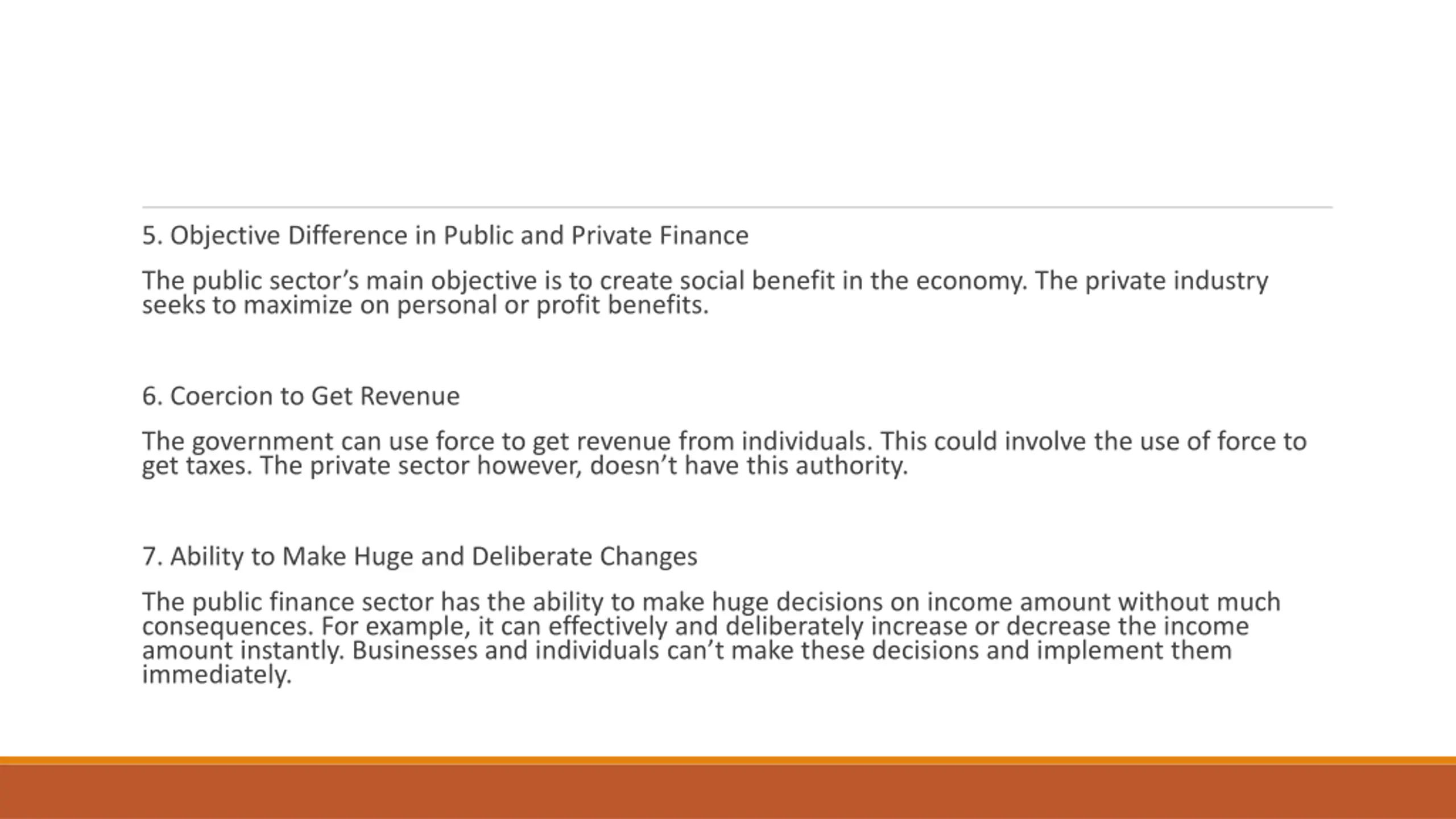 5. Objective Difference in Public and Private Finance The public sector s main objective is to create social benefit in the economy. The private industry seeks to maximize on personal or profit benefits. 6. Coercion to Get Revenue The government can use force to get revenue from individuals. This could involve the use of force to get taxes. The private sector however, doesn t have this authority. 7. Ability to Make Huge and Deliberate Changes The public finance sector has the ability to make huge decisions on income amount without much consequences. For example, it can effectively and deliberately increase or decrease the income amount instantly. Businesses and individuals can t make these decisions and implement them immediately.