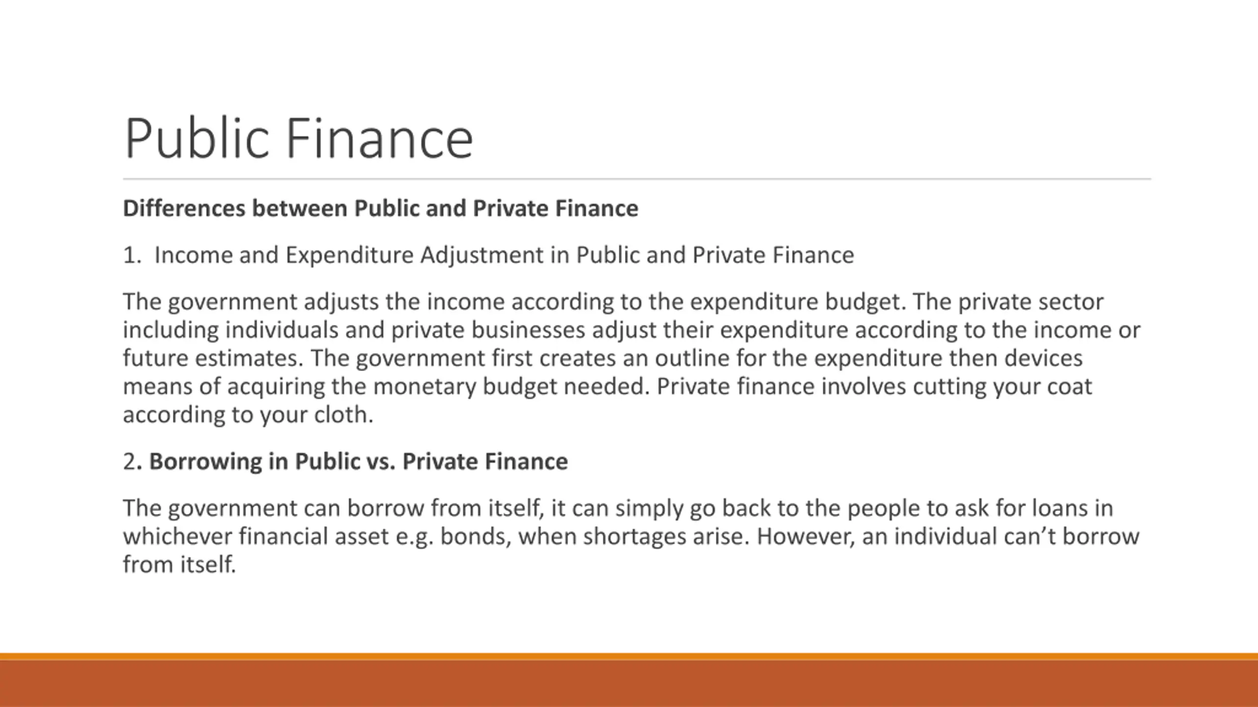 Public Finance Differences between Public and Private Finance 1. Income and Expenditure Adjustment in Public and Private Finance The government adjusts the income according to the expenditure budget. The private sector including individuals and private businesses adjust their expenditure according to the income or future estimates. The government first creates an outline for the expenditure then devices means of acquiring the monetary budget needed. Private finance involves cutting your coat according to your cloth. 2. Borrowing in Public vs. Private Finance The government can borrow from itself, it can simply go back to the people to ask for loans in whichever financial asset e.g. bonds, when shortages arise. However, an individual can t borrow from itself.