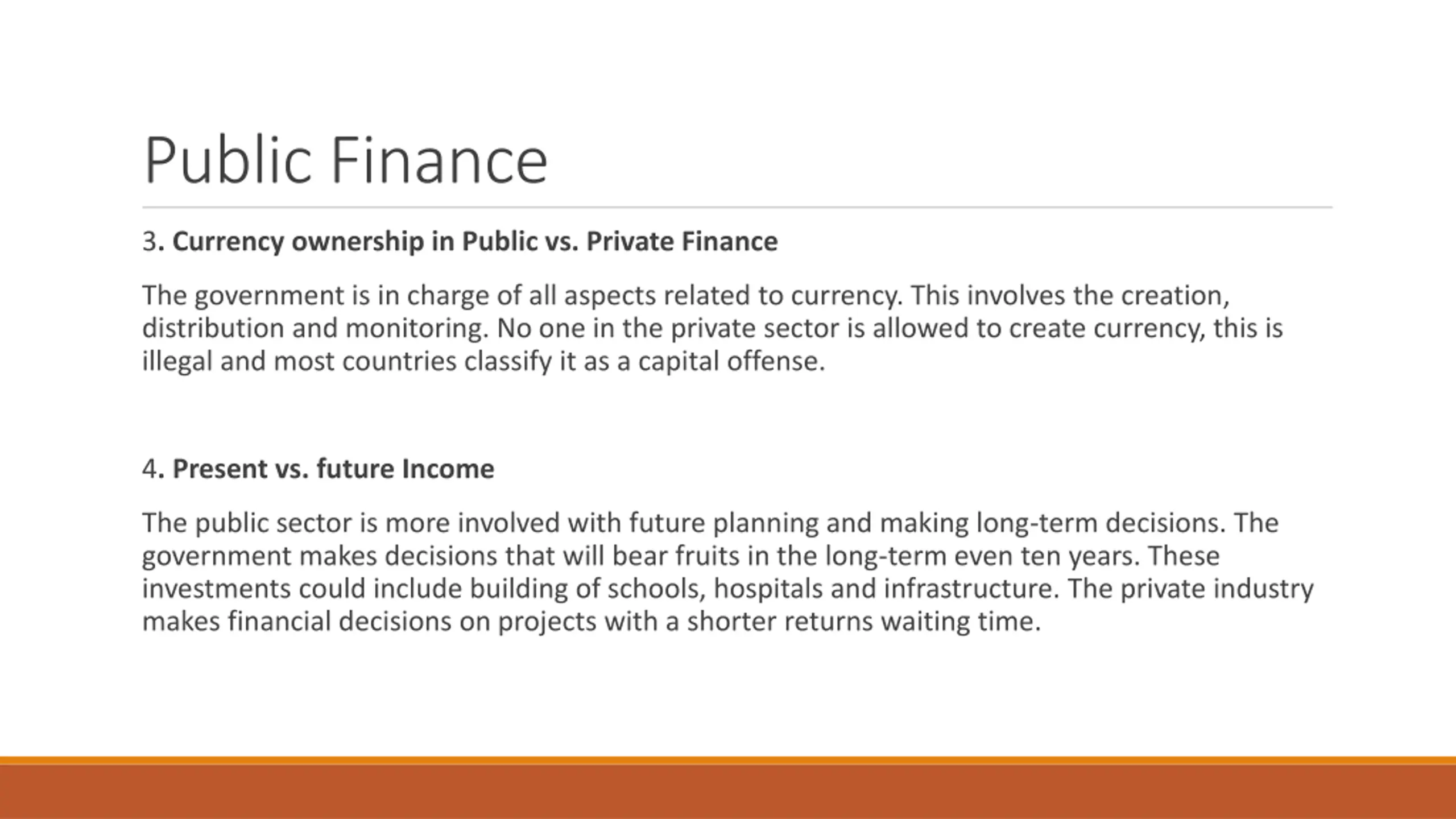 Public Finance 3. Currency ownership in Public vs. Private Finance The government is in charge of all aspects related to currency. This involves the creation, distribution and monitoring. No one in the private sector is allowed to create currency, this is illegal and most countries classify it as a capital offense. 4. Present vs. future Income The public sector is more involved with future planning and making long-term decisions. The government makes decisions that will bear fruits in the long-term even ten years. These investments could include building of schools, hospitals and infrastructure. The private industry makes financial decisions on projects with a shorter returns waiting time.