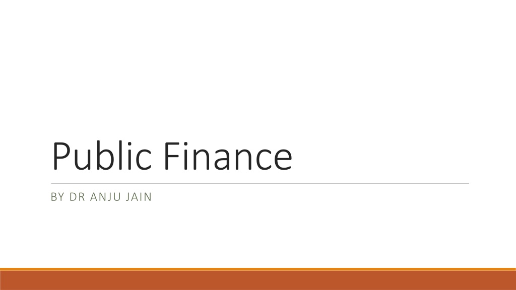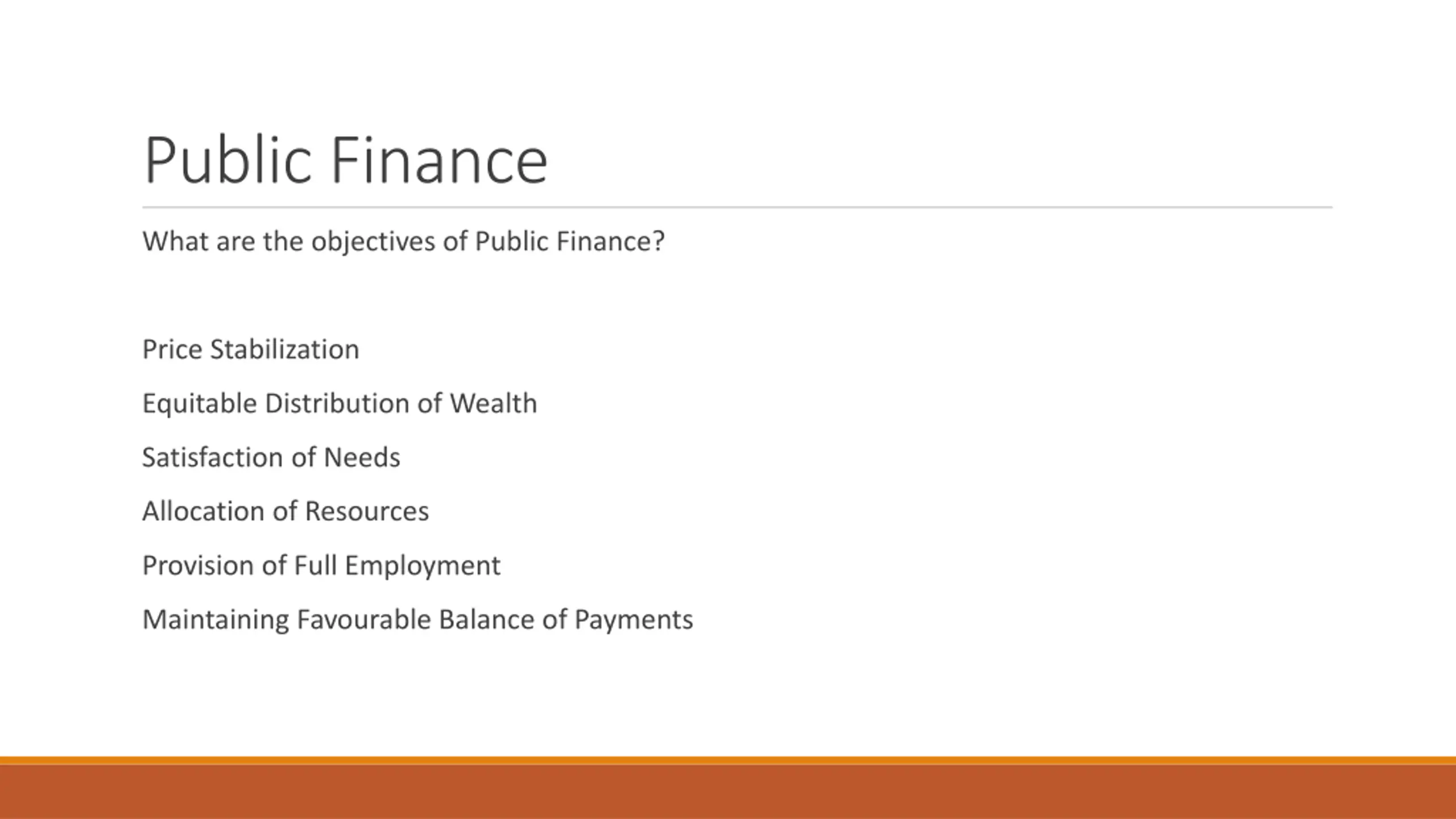 Public Finance What are the objectives of Public Finance? Price Stabilization Equitable Distribution of Wealth Satisfaction of Needs Allocation of Resources Provision of Full Employment Maintaining Favourable Balance of Payments