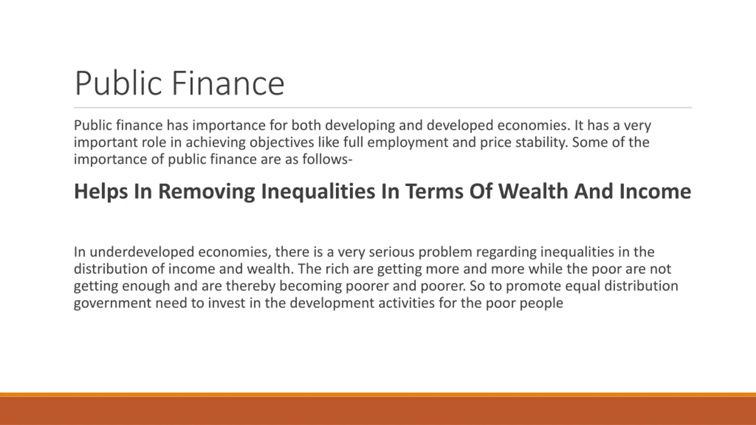Public Finance Public finance has importance for both developing and developed economies. It has a very important role in achieving objectives like full employment and price stability. Some of the importance of public finance are as follows- Helps In Removing Inequalities In Terms Of Wealth And Income In underdeveloped economies, there is a very serious problem regarding inequalities in the distribution of income and wealth. The rich are getting more and more while the poor are not getting enough and are thereby becoming poorer and poorer. So to promote equal distribution government need to invest in the development activities for the poor people
