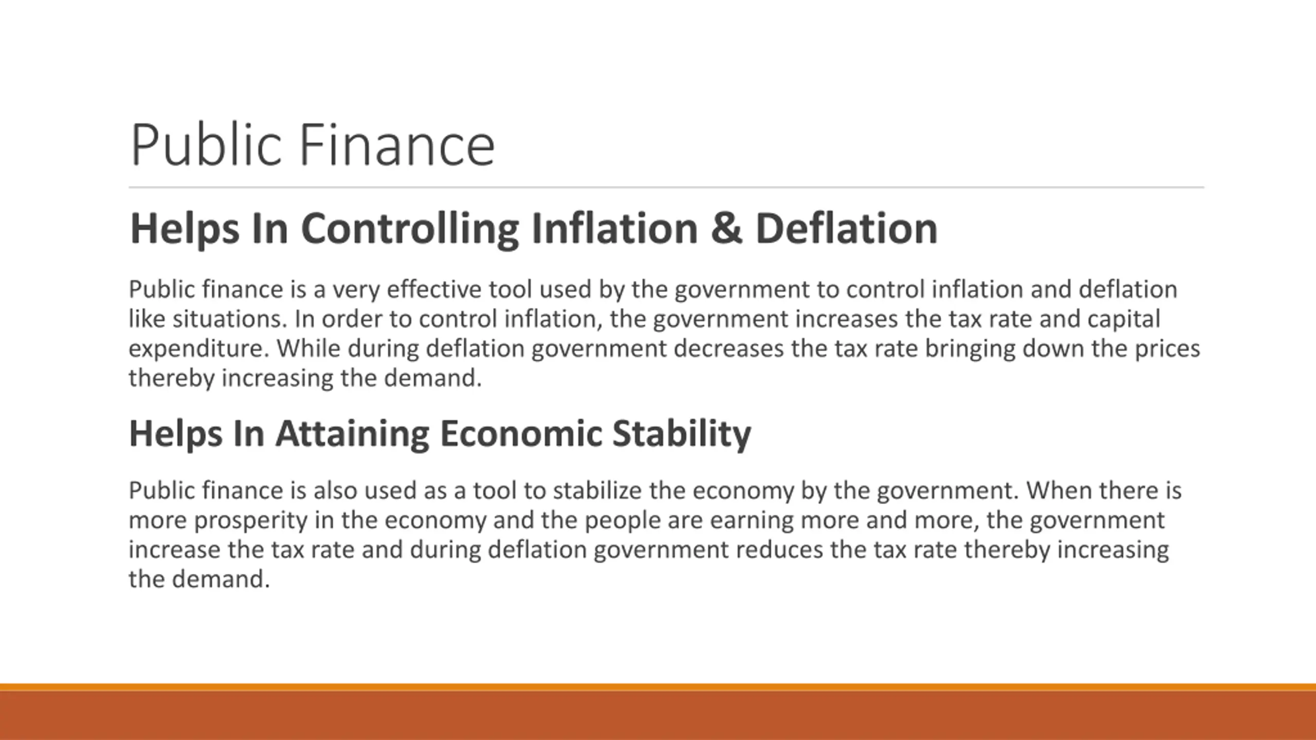 Public Finance Helps In Controlling Inflation & Deflation Public finance is a very effective tool used by the government to control inflation and deflation like situations. In order to control inflation, the government increases the tax rate and capital expenditure. While during deflation government decreases the tax rate bringing down the prices thereby increasing the demand. Helps In Attaining Economic Stability Public finance is also used as a tool to stabilize the economy by the government. When there is more prosperity in the economy and the people are earning more and more, the government increase the tax rate and during deflation government reduces the tax rate thereby increasing the demand.