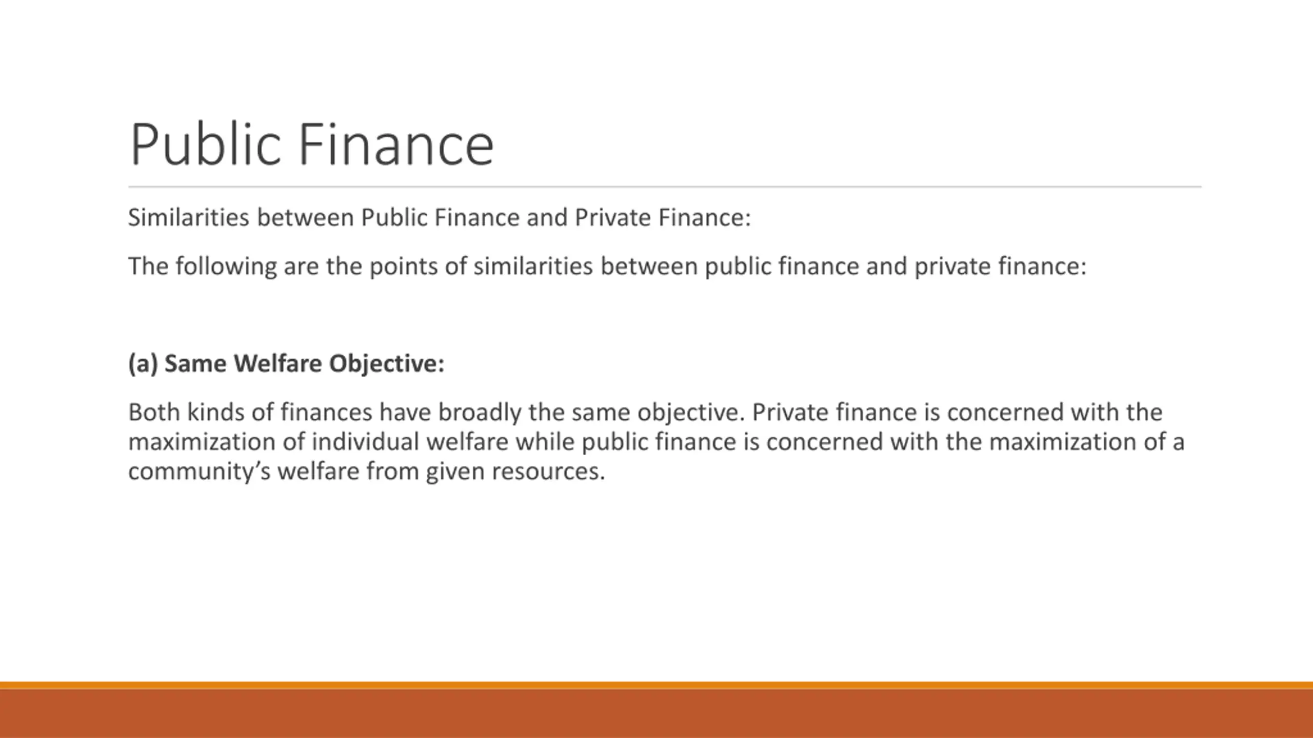 Public Finance Similarities between Public Finance and Private Finance: The following are the points of similarities between public finance and private finance: (a) Same Welfare Objective: Both kinds of finances have broadly the same objective. Private finance is concerned with the maximization of individual welfare while public finance is concerned with the maximization of a community s welfare from given resources.