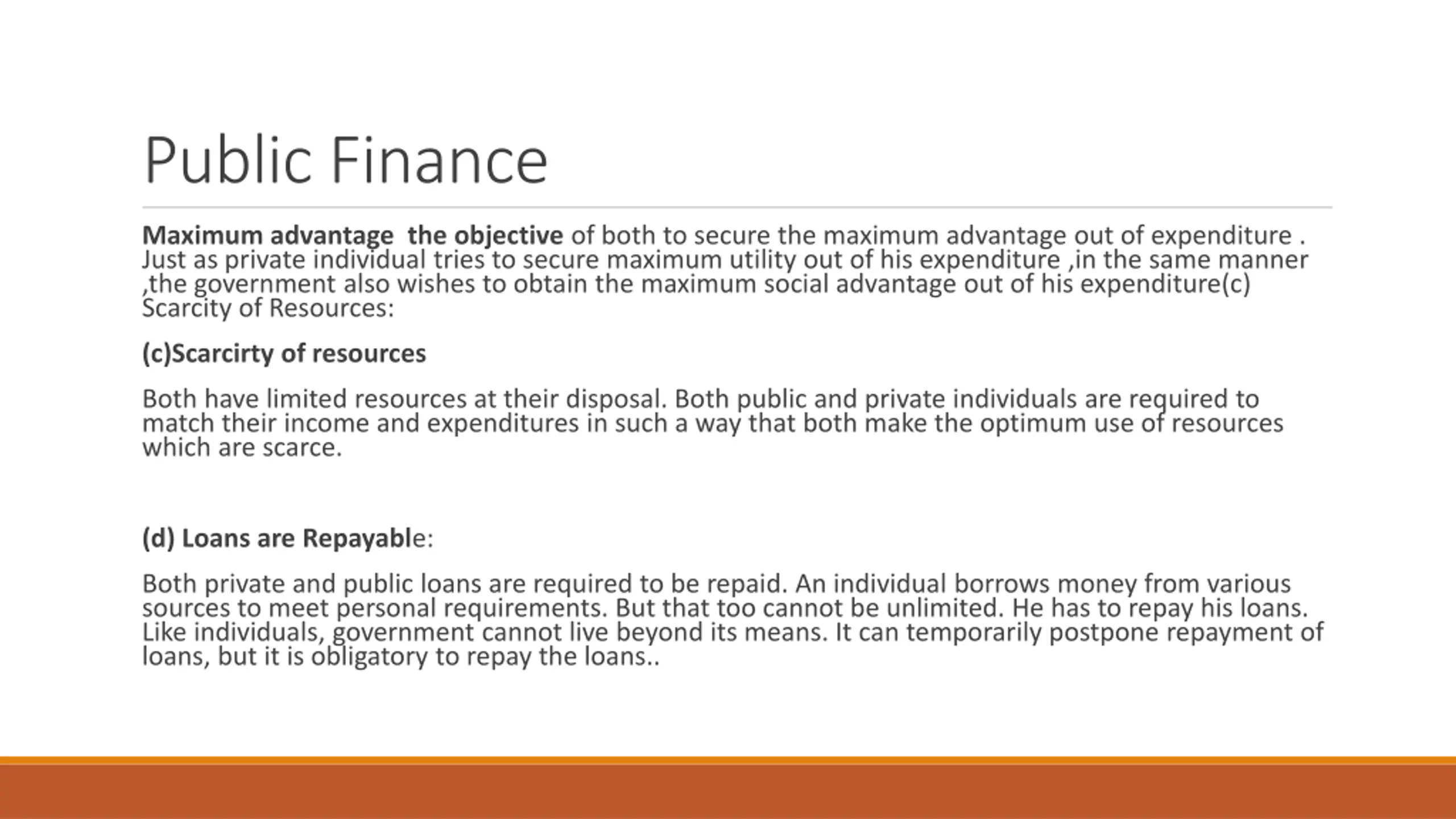 Public Finance Maximum advantage the objective of both to secure the maximum advantage out of expenditure . Just as private individual tries to secure maximum utility out of his expenditure ,in the same manner ,the government also wishes to obtain the maximum social advantage out of his expenditure(c) Scarcity of Resources: (c)Scarcirty of resources Both have limited resources at their disposal. Both public and private individuals are required to match their income and expenditures in such a way that both make the optimum use of resources which are scarce. (d) Loans are Repayable: Both private and public loans are required to be repaid. An individual borrows money from various sources to meet personal requirements. But that too cannot be unlimited. He has to repay his loans. Like individuals, government cannot live beyond its means. It can temporarily postpone repayment of loans, but it is obligatory to repay the loans..