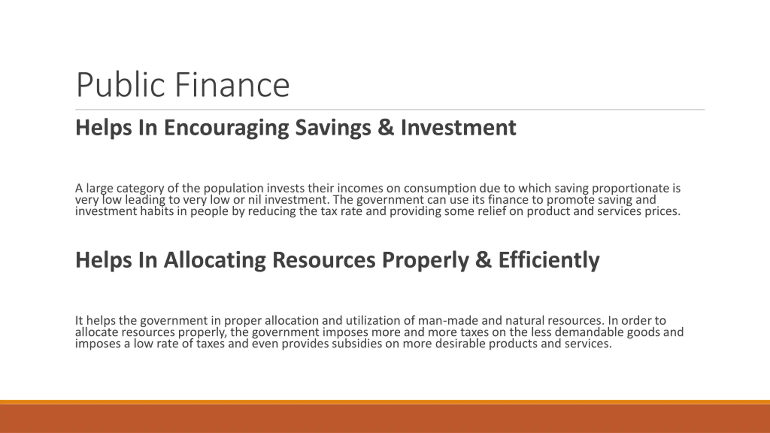 Public Finance Helps In Encouraging Savings & Investment A large category of the population invests their incomes on consumption due to which saving proportionate is very low leading to very low or nil investment. The government can use its finance to promote saving and investment habits in people by reducing the tax rate and providing some relief on product and services prices. Helps In Allocating Resources Properly & Efficiently It helps the government in proper allocation and utilization of man-made and natural resources. In order to allocate resources properly, the government imposes more and more taxes on the less demandable goods and imposes a low rate of taxes and even provides subsidies on more desirable products and services.