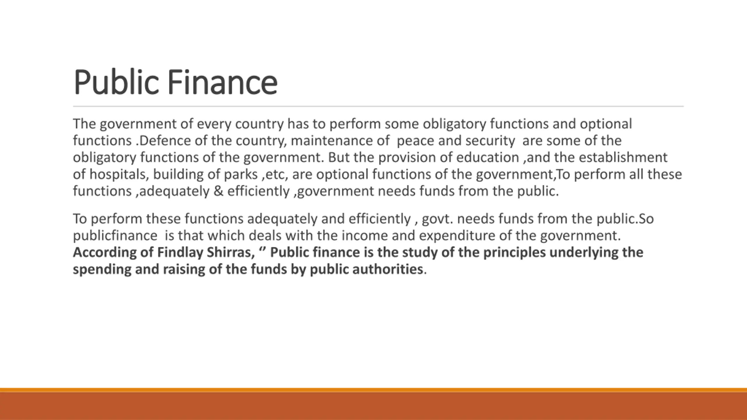 Public Finance Public Finance The government of every country has to perform some obligatory functions and optional functions .Defence of the country, maintenance of peace and security are some of the obligatory functions of the government. But the provision of education ,and the establishment of hospitals, building of parks ,etc, are optional functions of the government,To perform all these functions ,adequately & efficiently ,government needs funds from the public. To perform these functions adequately and efficiently , govt. needs funds from the public.So publicfinance is that which deals with the income and expenditure of the government. According of Findlay Shirras, Public finance is the study of the principles underlying the spending and raising of the funds by public authorities.
