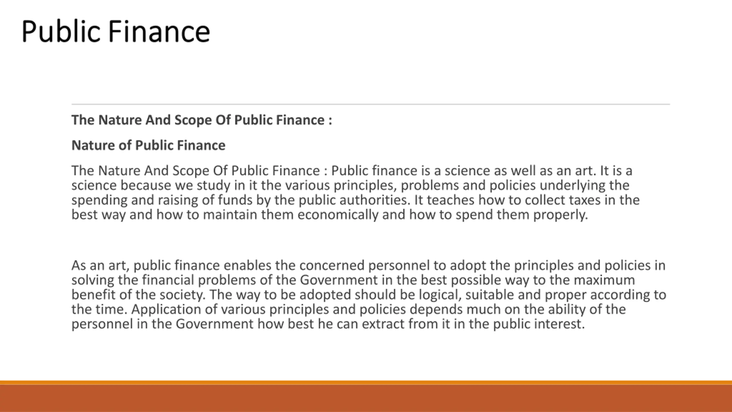 The Nature And Scope Of Public Finance : Nature of Public Finance The Nature And Scope Of Public Finance : Public finance is a science as well as an art. It is a science because we study in it the various principles, problems and policies underlying the spending and raising of funds by the public authorities. It teaches how to collect taxes in the best way and how to maintain them economically and how to spend them properly. As an art, public finance enables the concerned personnel to adopt the principles and policies in solving the financial problems of the Government in the best possible way to the maximum benefit of the society. The way to be adopted should be logical, suitable and proper according to the time. Application of various principles and policies depends much on the ability of the personnel in the Government how best he can extract from it in the public interest.