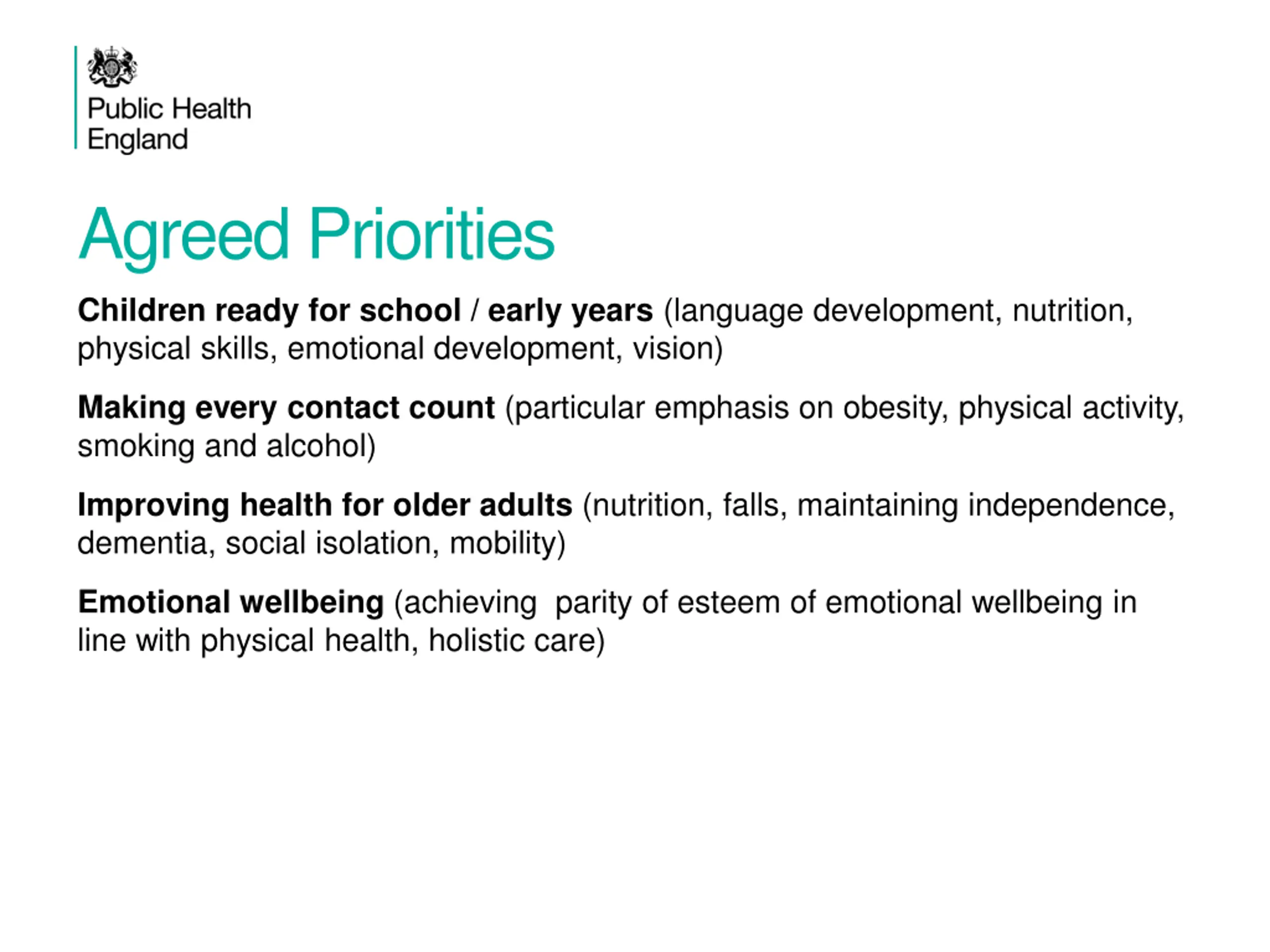 Agreed Priorities Children ready for school / early years (language development, nutrition, physical skills, emotional development, vision) Making every contact count (particular emphasis on obesity, physical activity, smoking and alcohol) Improving health for older adults (nutrition, falls, maintaining independence, dementia, social isolation, mobility) Emotional wellbeing (achieving parity of esteem of emotional wellbeing in line with physical health, holistic care) sustainability