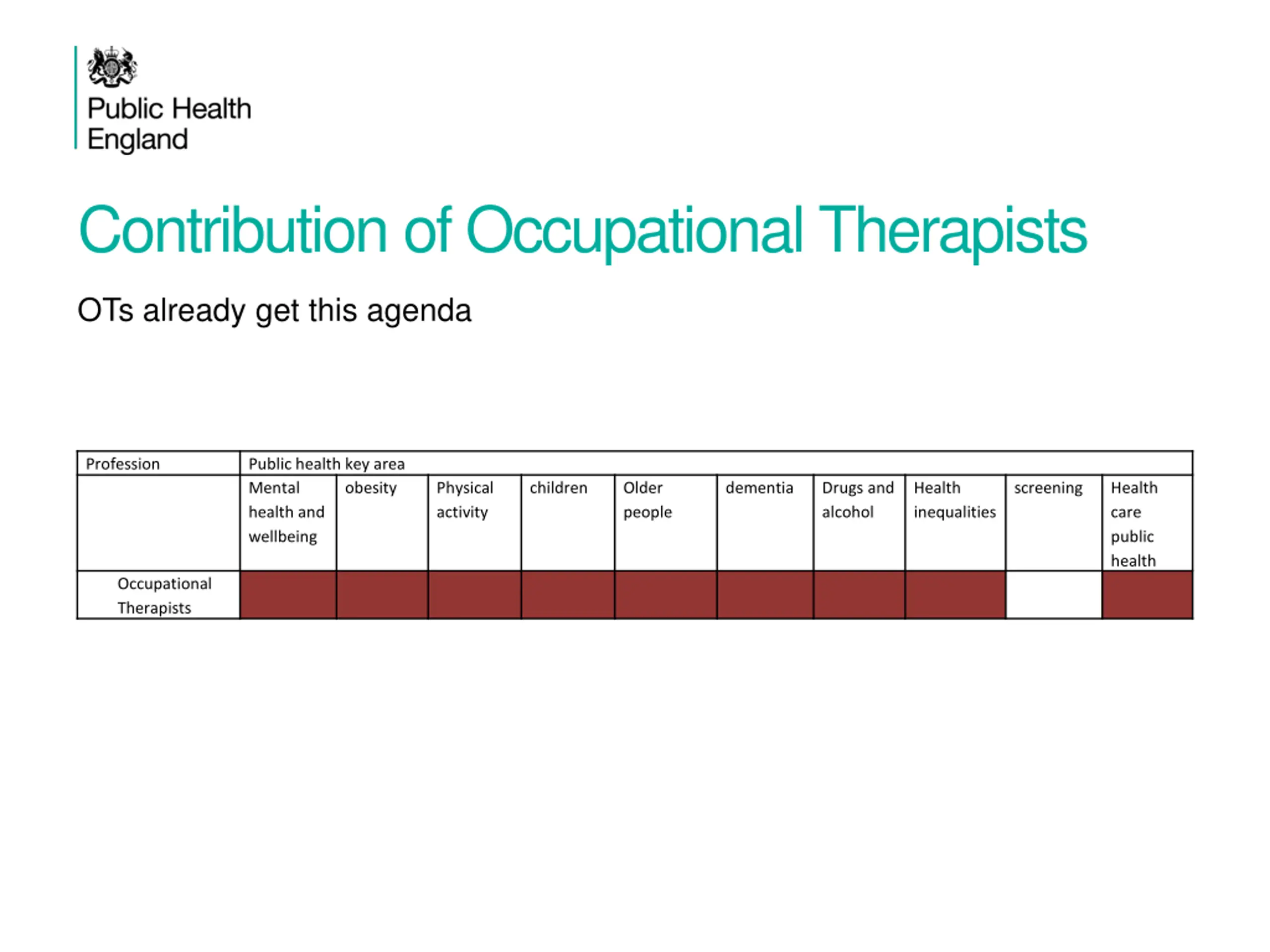 Contribution of Occupational Therapists OTs already get this agenda Profession Public health key area Mental health and wellbeing obesity Physical activity children Older people dementia Drugs and alcohol Health inequalities screening Health care public health Occupational Therapists sustainability