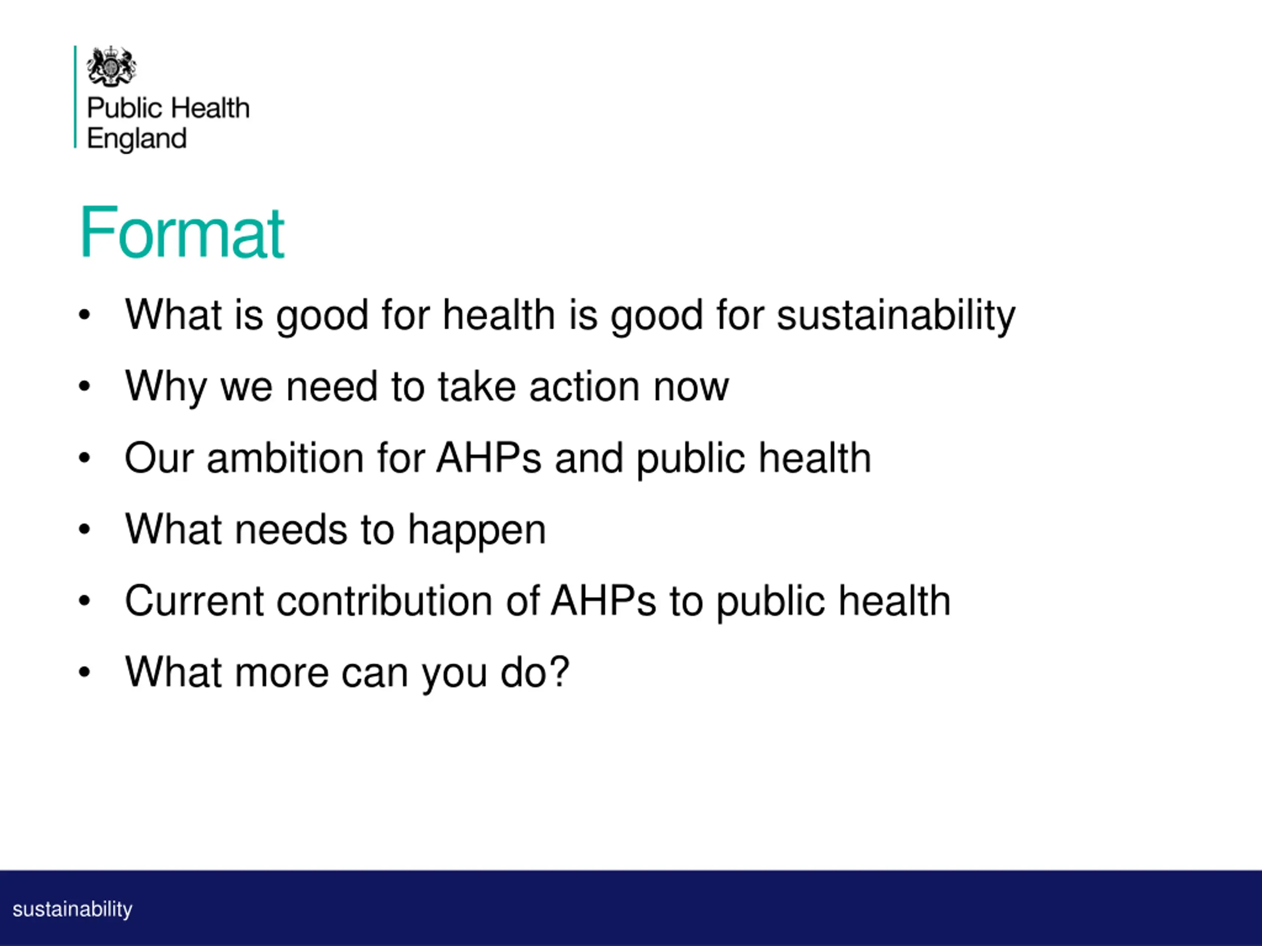 Format What is good for health is good for sustainability Why we need to take action now Our ambition for AHPs and public health What needs to happen Current contribution of AHPs to public health What more can you do? sustainability sustainability