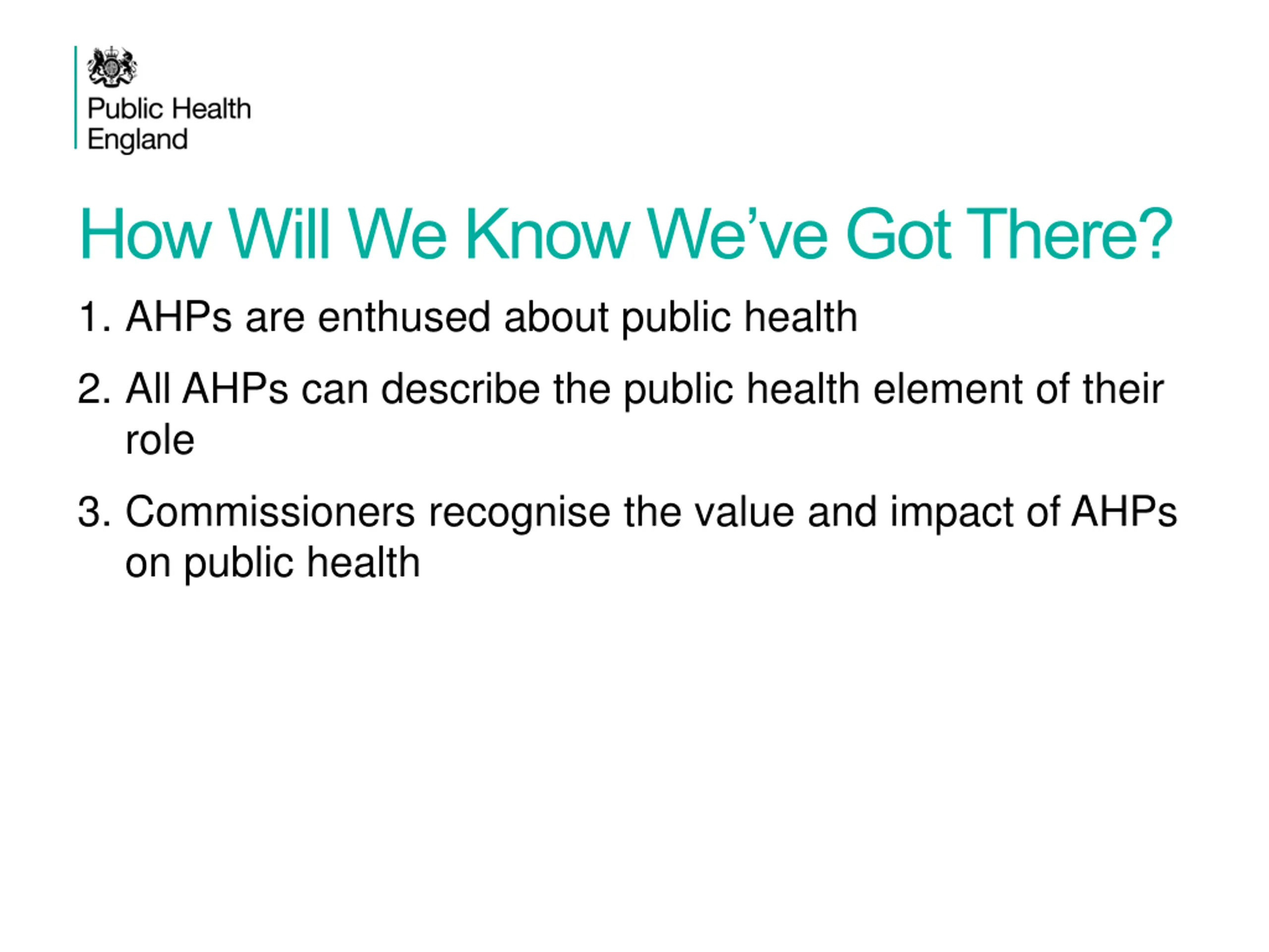 How Will We Know Weve Got There? 1. AHPs are enthused about public health 2. All AHPs can describe the public health element of their role 3. Commissioners recognise the value and impact of AHPs on public health sustainability