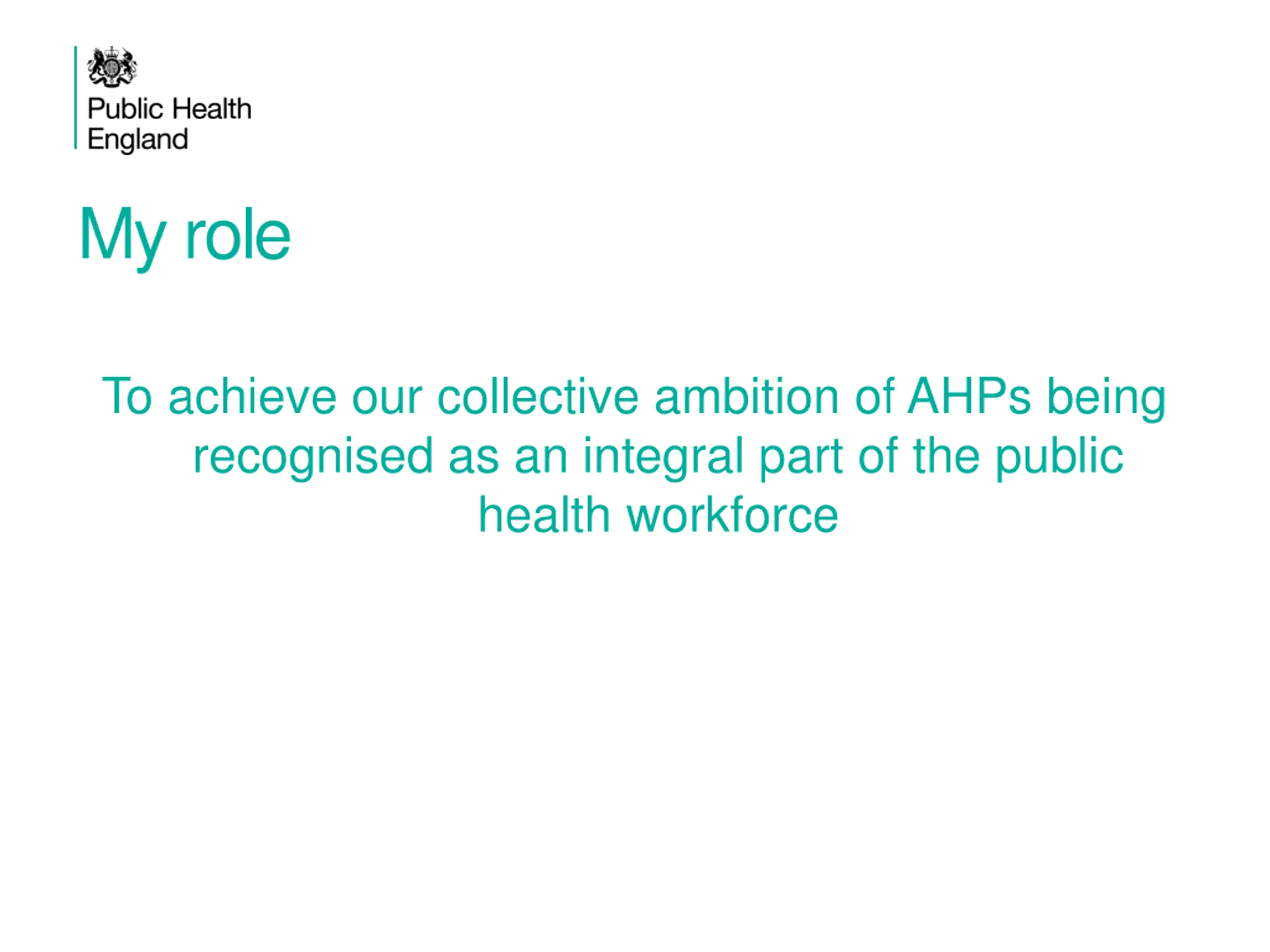 My role To achieve our collective ambition of AHPs being recognised as an integral part of the public health workforce sustainability
