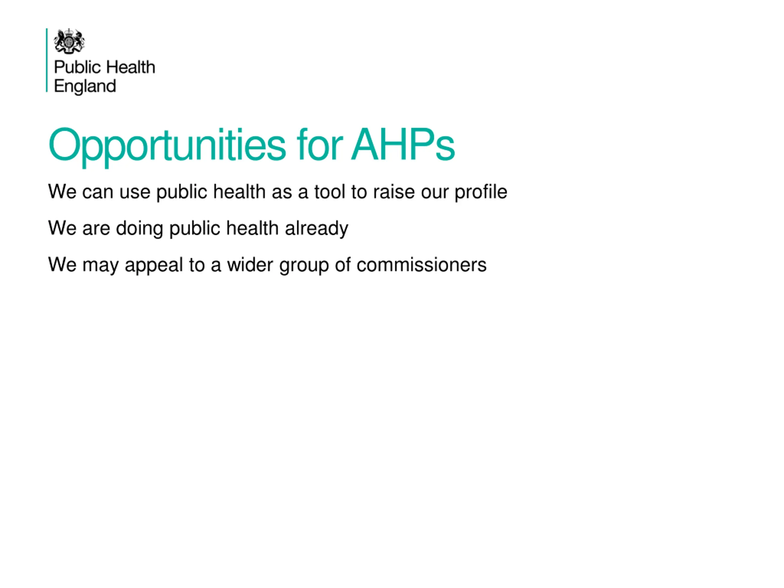 Opportunities for AHPs We can use public health as a tool to raise our profile We are doing public health already We may appeal to a wider group of commissioners sustainability