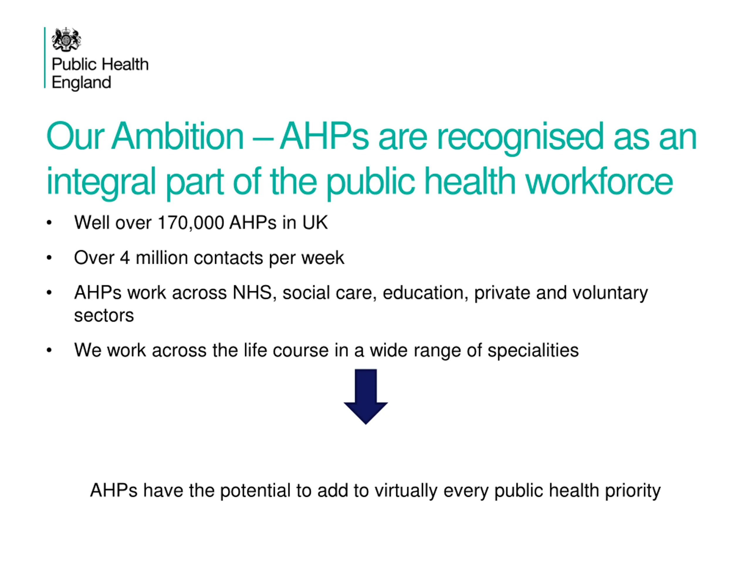 Our Ambition AHPs are recognised as an integral part of the public health workforce Well over 170,000 AHPs in UK Over 4 million contacts per week AHPs work across NHS, social care, education, private and voluntary sectors We work across the life course in a wide range of specialities AHPs have the potential to add to virtually every public health priority sustainability