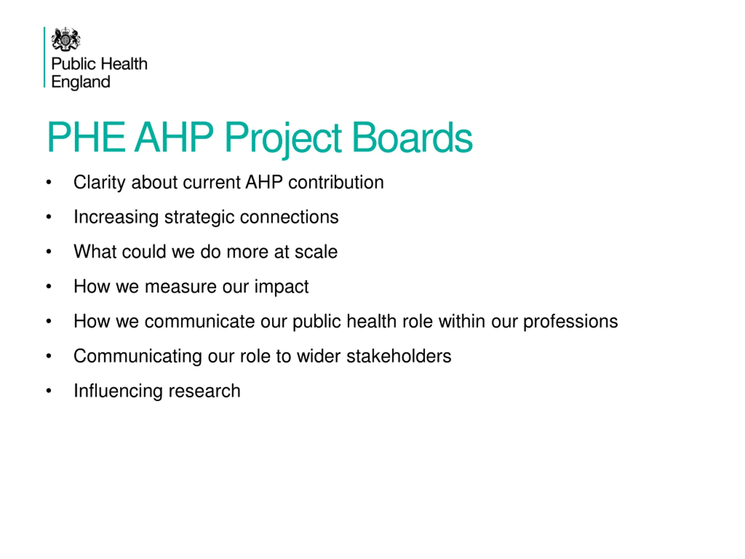 PHE AHP Project Boards Clarity about current AHP contribution Increasing strategic connections What could we do more at scale How we measure our impact How we communicate our public health role within our professions Communicating our role to wider stakeholders Influencing research sustainability