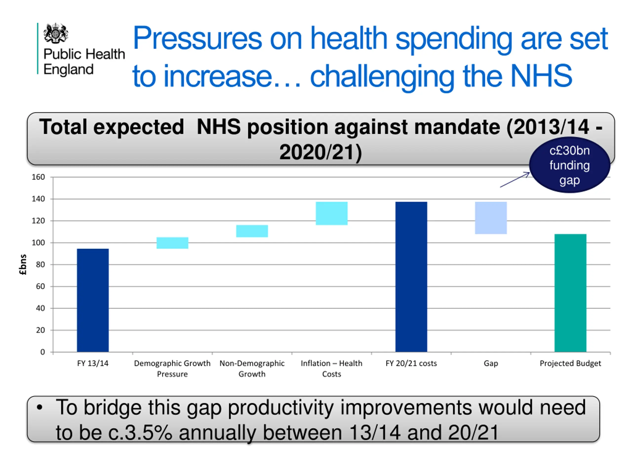 Pressures on health spending are set to increase challenging the NHS Total expected NHS position against mandate (2013/14 - Total Expected Costs position against mandate between FY 13/14 & FY 20/21 2020/21) c 30bn funding Pressure gap 160 140 120 100 bns 80 60 40 20 0 FY 13/14 Demographic Growth Pressure Non-Demographic Growth Inflation Health Costs FY 20/21 costs Gap Projected Budget To bridge this gap productivity improvements would need to be c.3.5% annually between 13/14 and 20/21 sustainability Source: NHS England (2013)