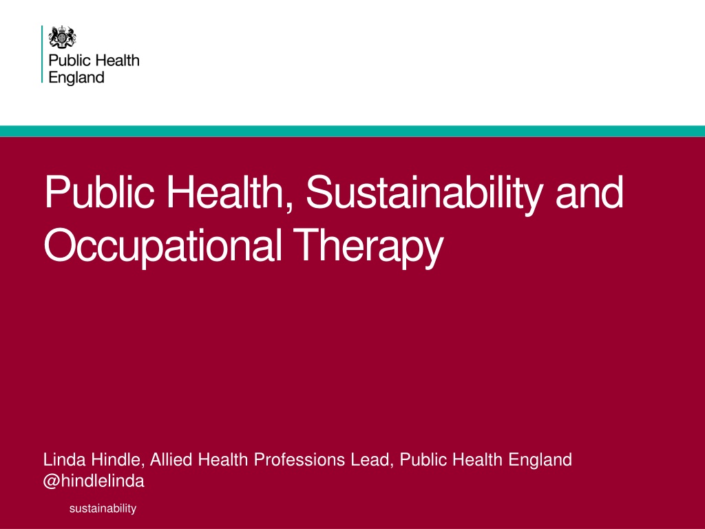 Public Health, Sustainability and Occupational Therapy Linda Hindle, Allied Health Professions Lead, Public Health England @hindlelinda sustainability