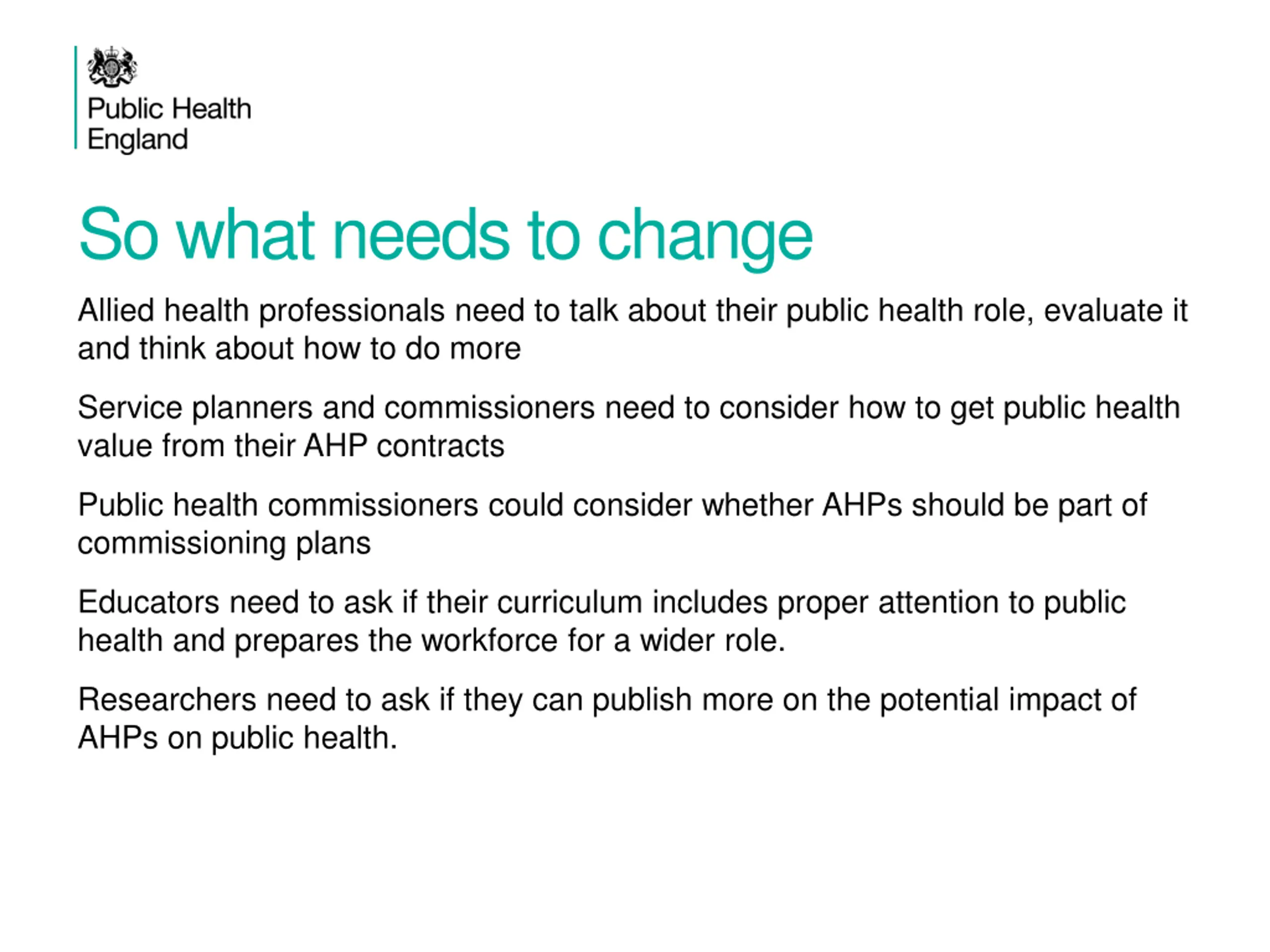 So what needs to change Allied health professionals need to talk about their public health role, evaluate it and think about how to do more Service planners and commissioners need to consider how to get public health value from their AHP contracts Public health commissioners could consider whether AHPs should be part of commissioning plans Educators need to ask if their curriculum includes proper attention to public health and prepares the workforce for a wider role. Researchers need to ask if they can publish more on the potential impact of AHPs on public health. sustainability