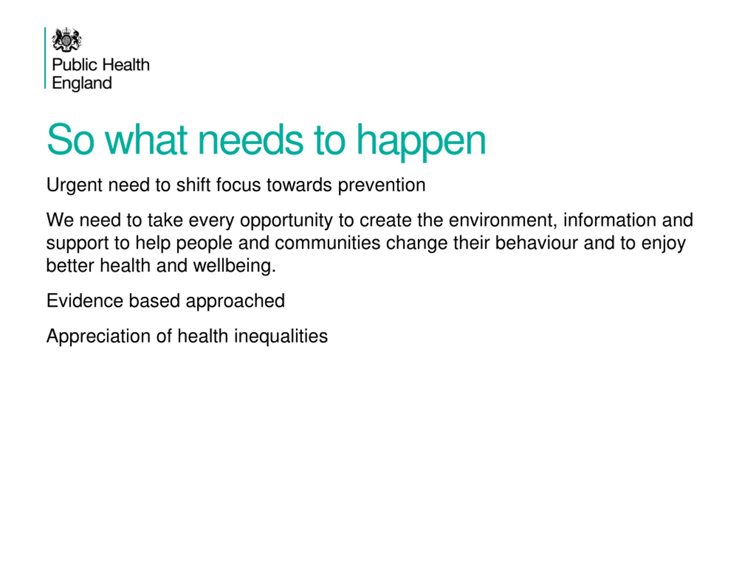 So what needs to happen Urgent need to shift focus towards prevention We need to take every opportunity to create the environment, information and support to help people and communities change their behaviour and to enjoy better health and wellbeing. Evidence based approached Appreciation of health inequalities sustainability