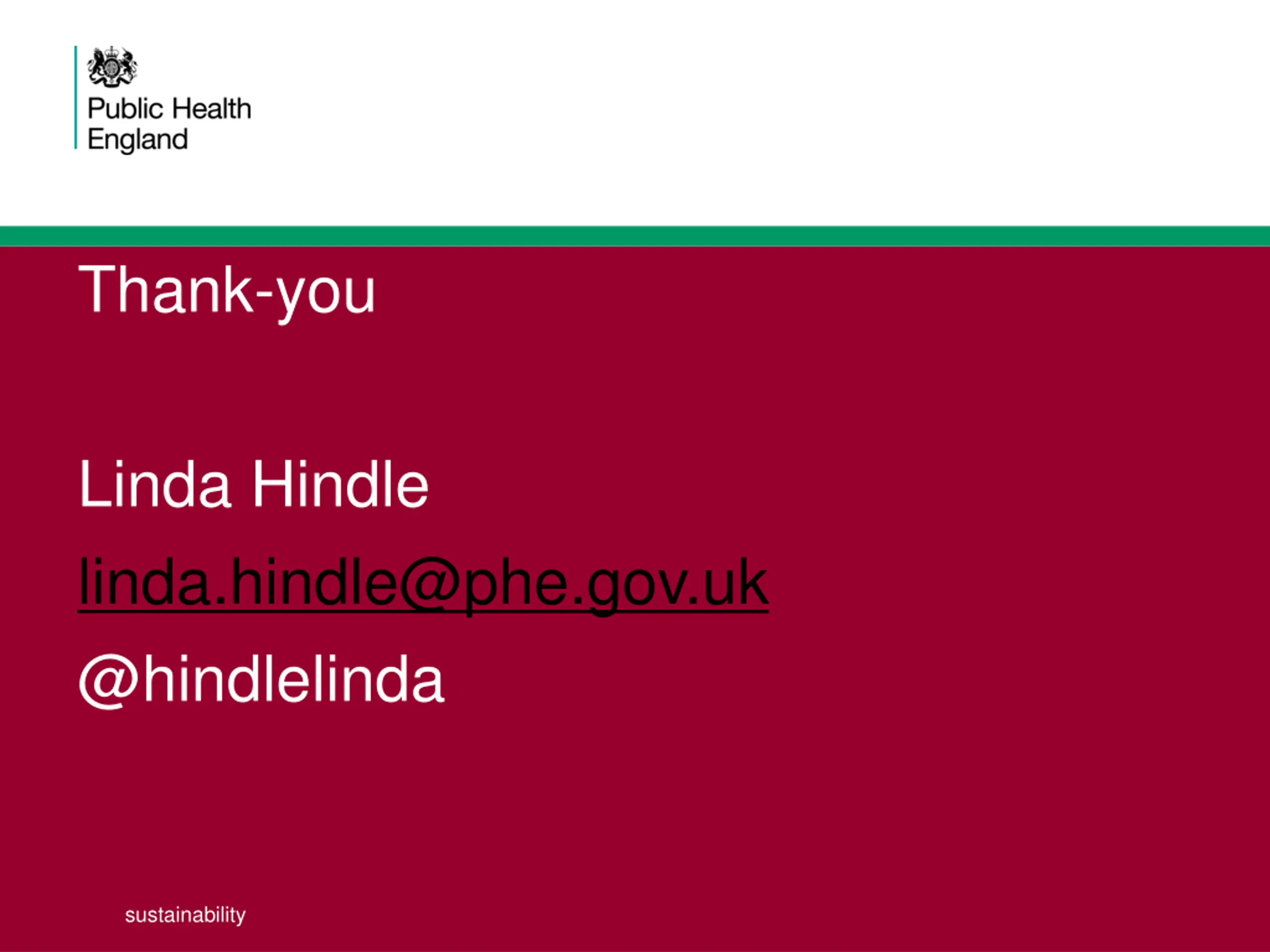 Thank-you Linda Hindle linda.hindle@phe.gov.uk @hindlelinda sustainability